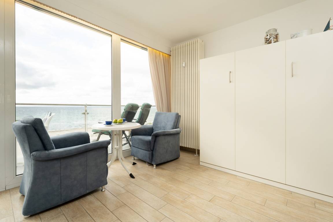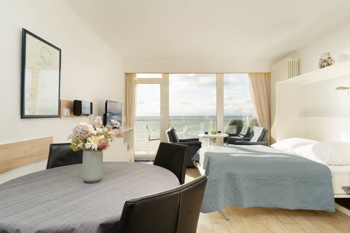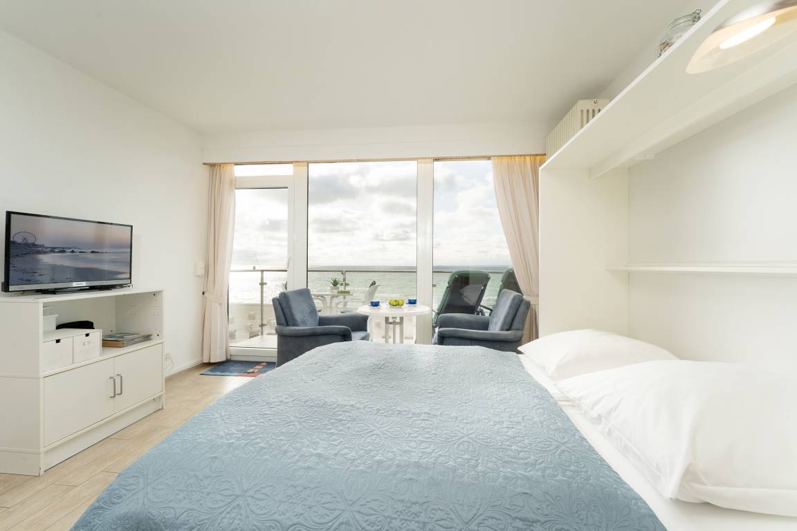 Das Herzstück dieser 1-Zimmer-Ferienwohnung ist der offene, lichtdurchflutete Wohn- und Schlafraum mit Zugang zum möblierten Balkon mit Süd-Ost-Ausrichtung. Direkt vom Bett aus haben Sie einen fantastischen Blick auf die Ostsee und können sogar den Sonnenaufgang genießen.