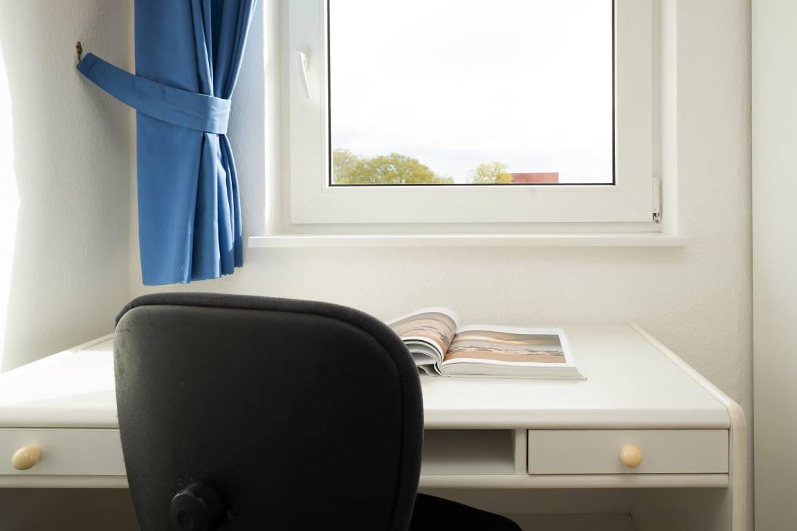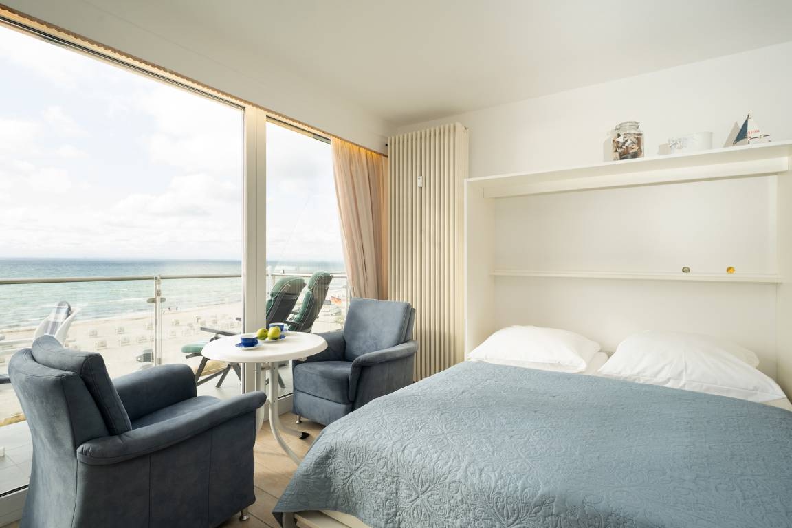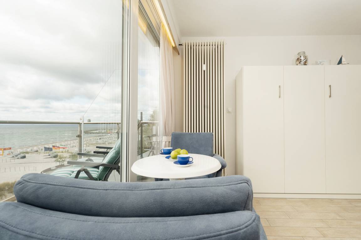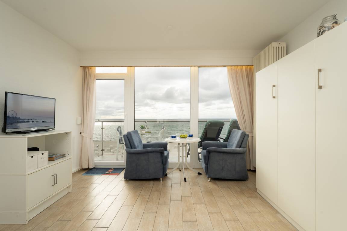 Das Herzstück dieser 1-Zimmer-Ferienwohnung ist der offene, lichtdurchflutete Wohn- und Schlafraum mit Zugang zum möblierten Balkon mit Süd-Ost-Ausrichtung. Direkt vom Bett aus haben Sie einen fantastischen Blick auf die Ostsee und können sogar den Sonnenaufgang genießen.