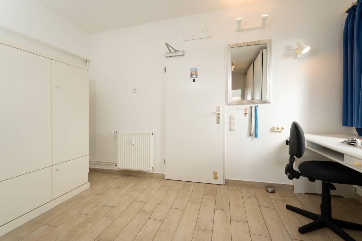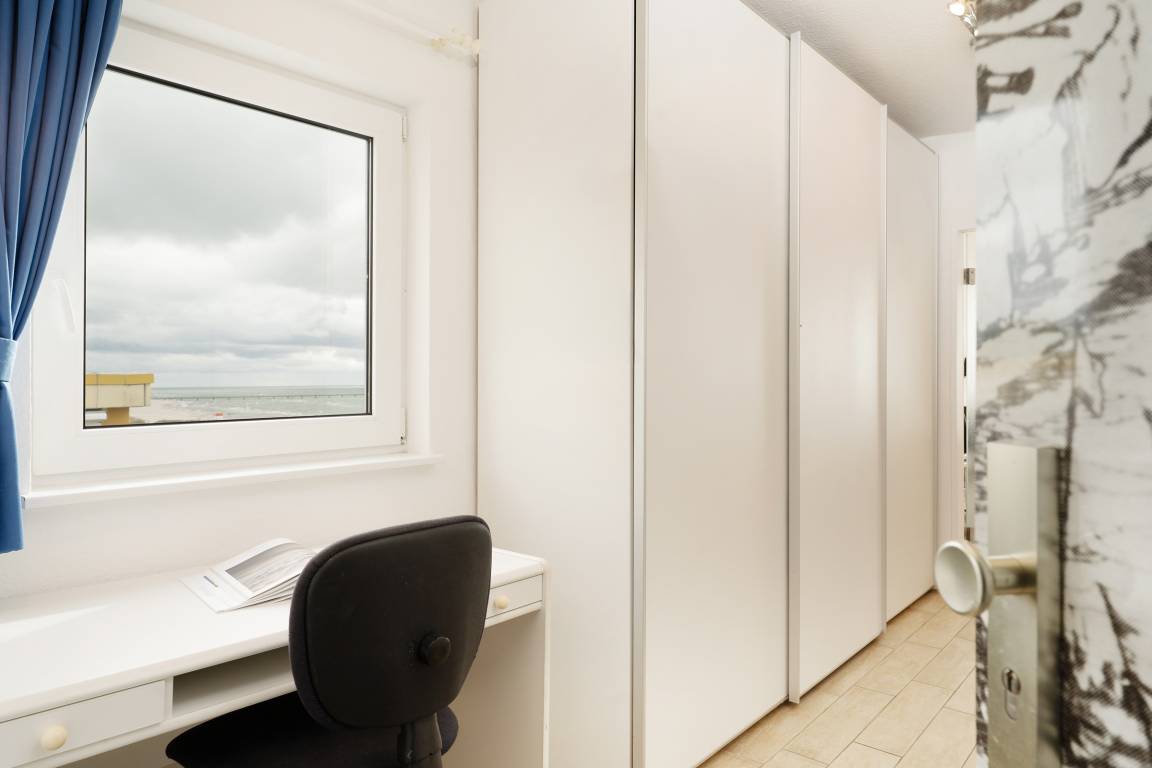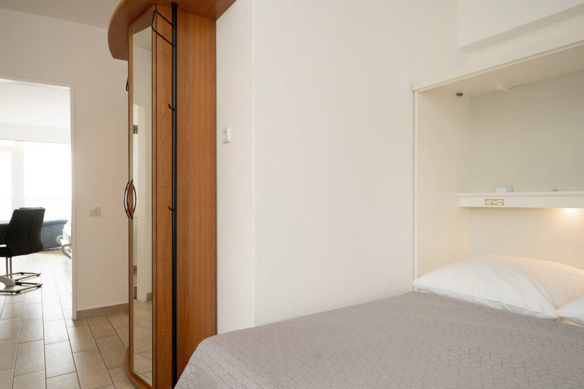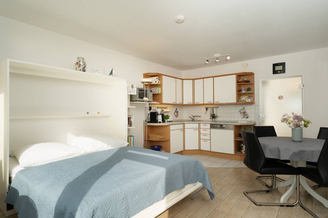 Bis zu 3 Personen können sich in dieser Wohnung mit ca. 43 m² Wohnfläche in direkter Strandnähe erholen. Die Schlafmöglichkeiten bestehen aus einem Schrankbett (140x200 cm) im Wohnbereich sowie einem weiteren Schrankbett (2x 80x200 cm) im Eingangsbereich der Wohnung. Der Wohn- und Schlafraum lässt sich mit elektrischen Rollläden verdunkeln. Für Unterhaltung sorgen ein Flachbildfernseher, ein Radio sowie sowie eine Stereoanlage für Radio, CD, USB und Card iPod. Die offene Küche ist gut ausgestattet und sorgt mit diversen Alltagshelfern für Freude beim Kochen. Der runde Esstisch lädt zu geselligen Mahlzeiten ein. Das hochwertige Badezimmer ist mit einer großzügigen Dusche, einem großem, beleuchtetem Spiegel sowie einem Waschtisch gut ausgestattet und stilvoll gestaltet. Im Flur befindet sich eine Garderobe mit geräumigem Schiebetürenschrank für Ihre Urlaubsgarderobe.