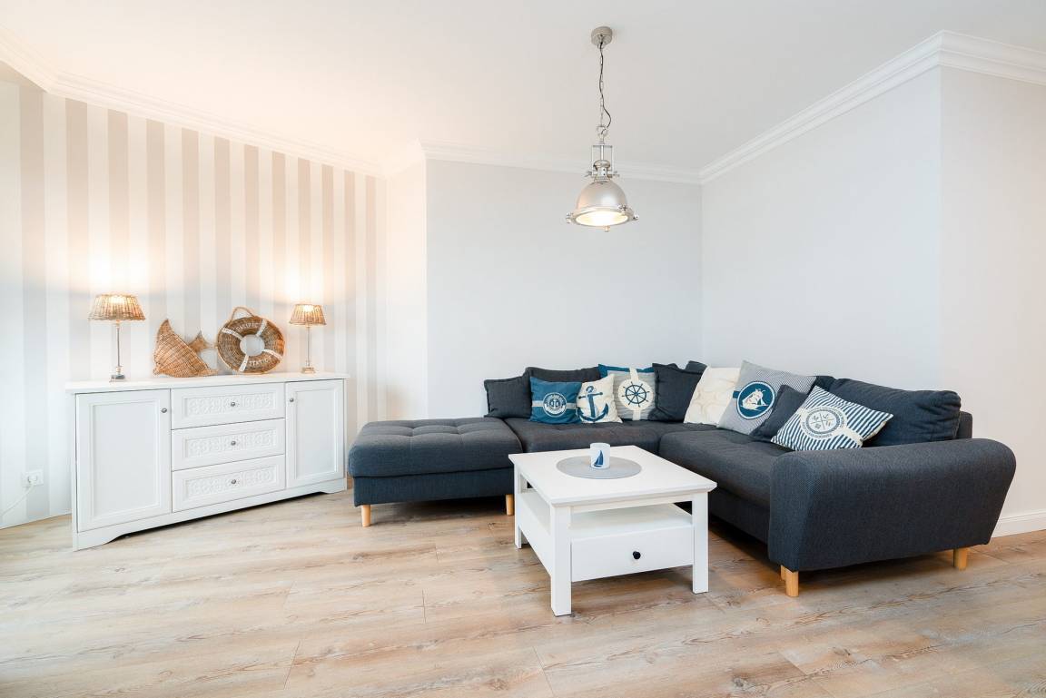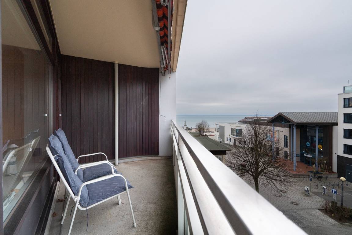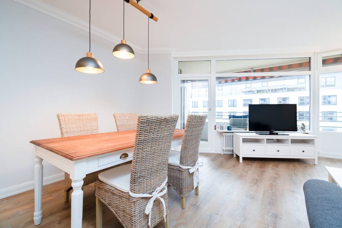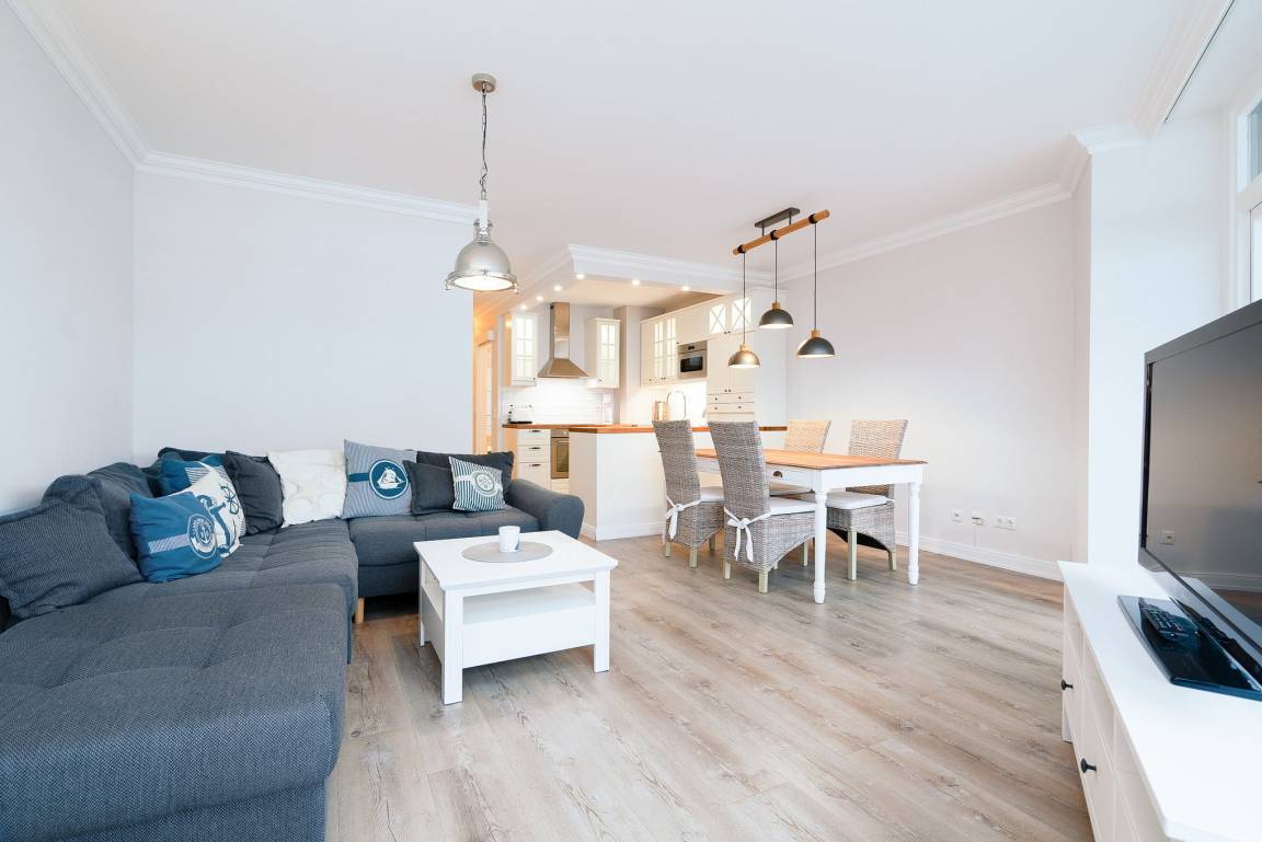 Die Wohnung ist aufgeteilt in einen großen Wohn/Essbereich mit offener Küche. Von hieraus treten Sie auf den großen überdachten Balkon, der einen fantastischen, seitlichen Blick auf die Ostsee bietet. Für eine angenehme Beschattung sorgt die elektrische Markise. Das Wohn- und Esszimmer ist mit einem Essplatz für 4 Personen, einer Eckcouch, einem Couchtisch und einer Kommode ausgestattet. Zur Unterhaltung steht ein Flachbildschirm zur Verfügung. Das Zimmer ist mit Laminatboden verlegt.