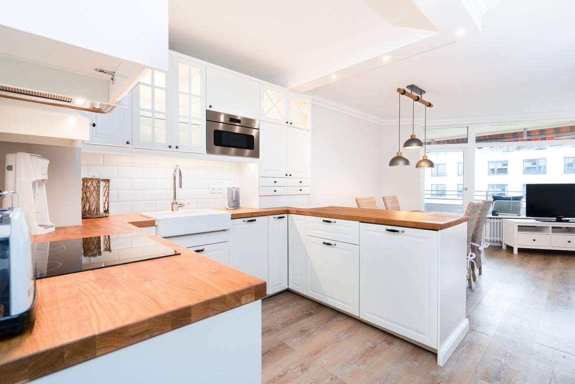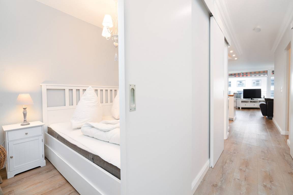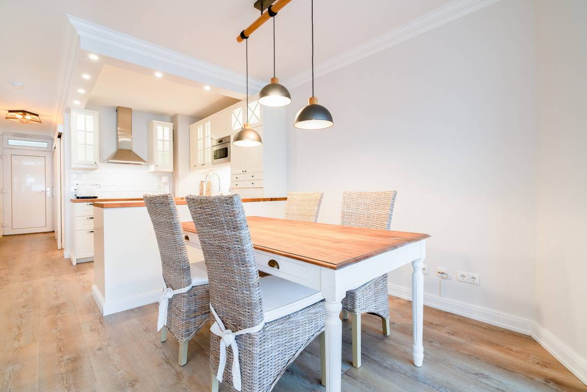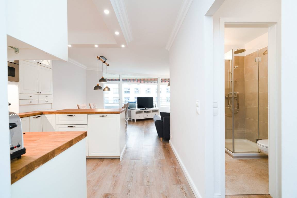 Die Wohnung ist aufgeteilt in einen großen Wohn/Essbereich mit offener Küche. Von hieraus treten Sie auf den großen überdachten Balkon, der einen fantastischen, seitlichen Blick auf die Ostsee bietet. Für eine angenehme Beschattung sorgt die elektrische Markise. Das Wohn- und Esszimmer ist mit einem Essplatz für 4 Personen, einer Eckcouch, einem Couchtisch und einer Kommode ausgestattet. Zur Unterhaltung steht ein Flachbildschirm zur Verfügung. Das Zimmer ist mit Laminatboden verlegt.