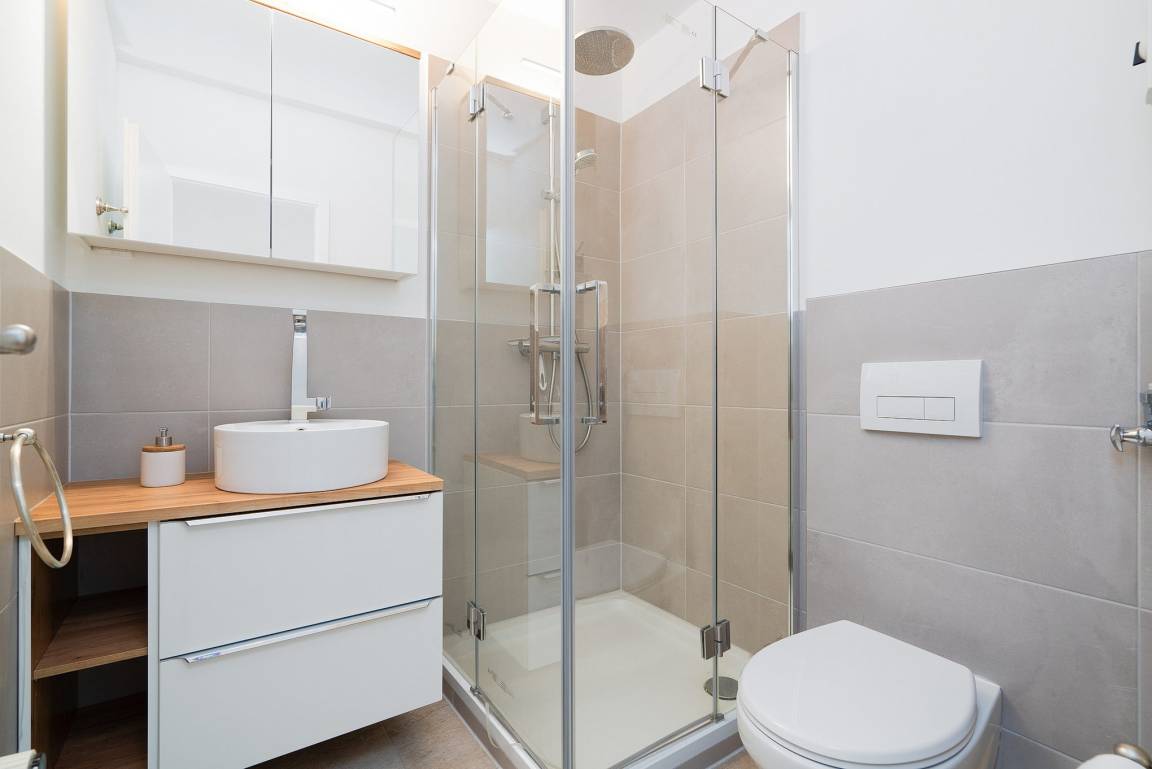 Helles Bad mit Dusche, WC und Waschbecken.