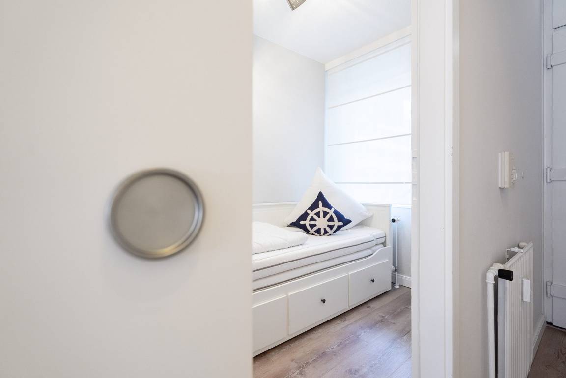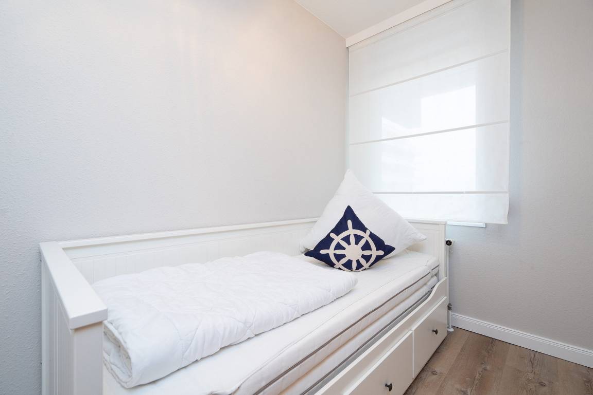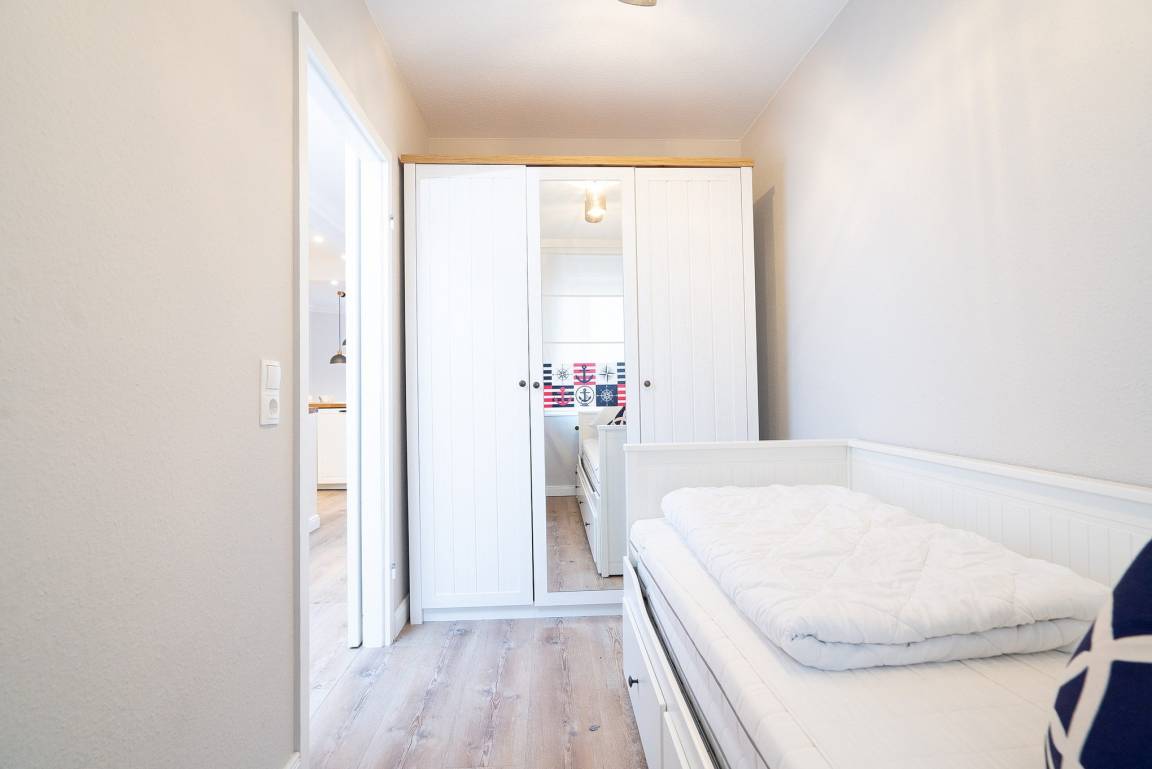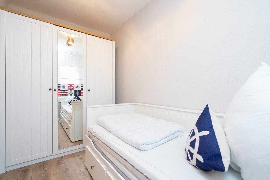 In dem Kinderzimmer befindet sich ein ausziehbares Bett und ebenfalls ein Kleiderschrank. Das Zimmer lässt sich durch einen Vorhang etwas verdunkeln.
