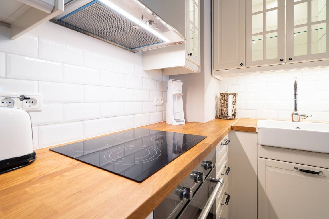 Moderne, zum Wohn- und Esszimmer offene, komplett eingerichtete Küche mit 4 Platten Cerankochfeld, Backofen, Spülmaschine, Kühlschrank, Mikrowelle, Toaster, Wasserkocher und Kaffeemaschine.