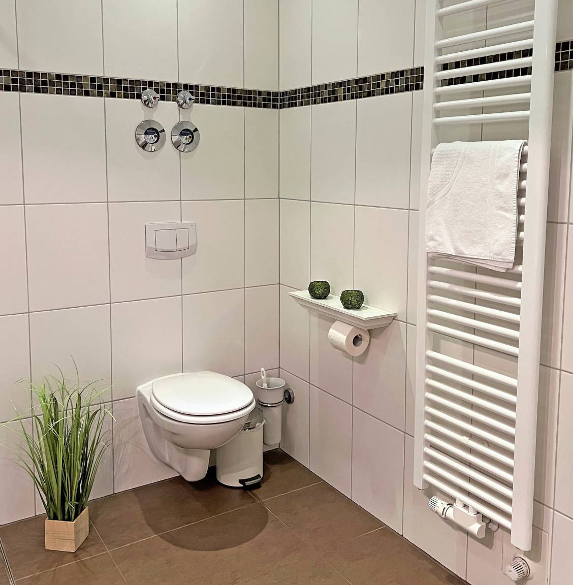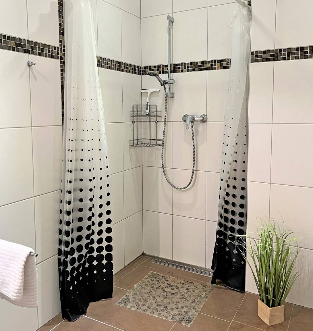Das großzügige Badezimmer ist ausgestattet mit einer ebenerdigen Dusche, WC, Waschbecken, Handtuchheizkörper und einer Fußbodenheizung.