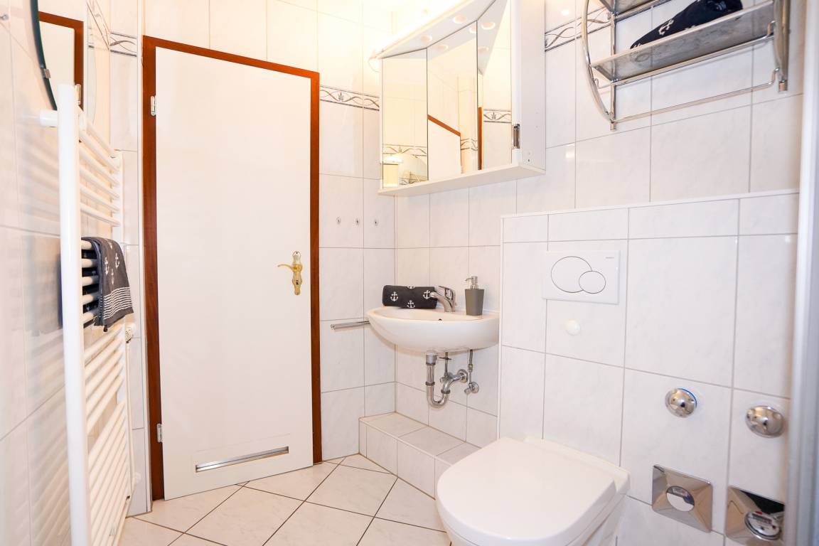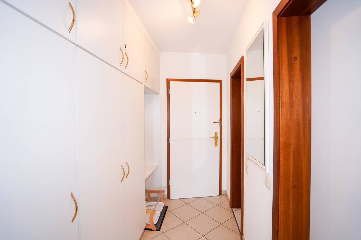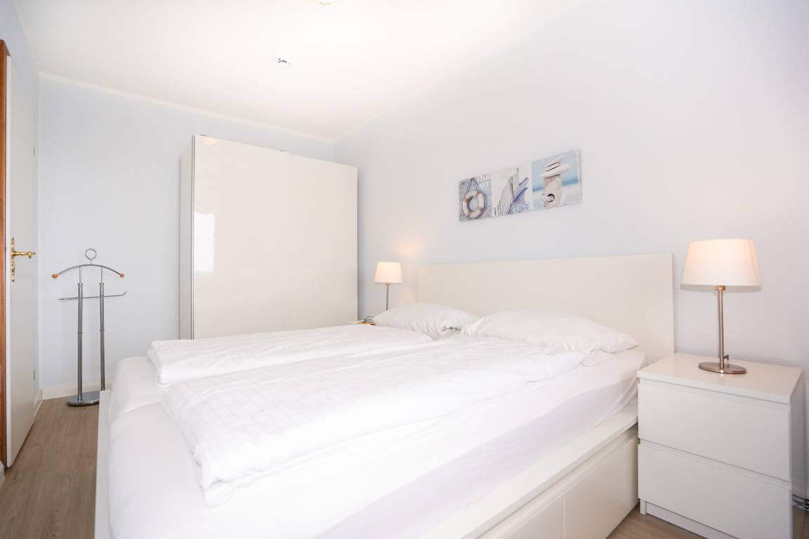 Das freundliche Schlafzimmer ist mit einem Doppelbett und einem Kleiderschrank ausgestattet. Einbauschränke im Flurbereich bieten weiteren Stauraum. Im Badezimmer finden Sie eine Dusche, WC, Waschbecken und Handtuchheizkörper vor.