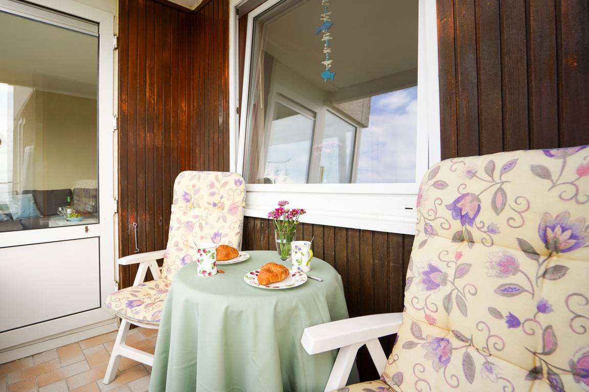 Das Wohnzimmer bietet Ihnen ein großes Eckschlafsofa, einen Esstisch mit 4 Stühlen und einen großen Fernseher. Erholen Sie sich nach einem aufregenden Urlaubstag auf dem Balkon mit Blick auf die Ostsee.