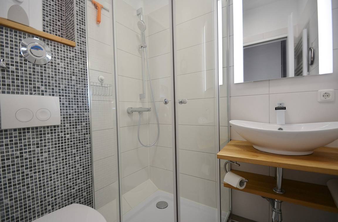 Modernes, freundliches Bad mit Dusche, WC und Waschbecken.