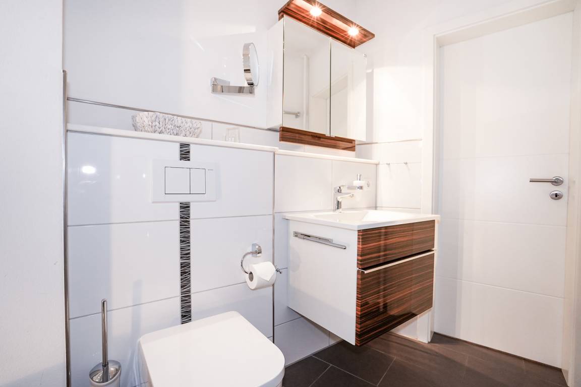 Im Schlafzimmer finden Sie ein großes und bequemes Doppelbett (180 x 200cm), einen Schrank und ein Schlafsofa (90 x 200cm) vor. Im Flur steht Ihnen ein weiterer großzügiger Schrank für Ihre Urlaubsgarderobe zur Verfügung. Das sehr hochwertige Badezimmer mit Dusche zeichnet sich durch sein angenehmes Lichtkonzept aus.