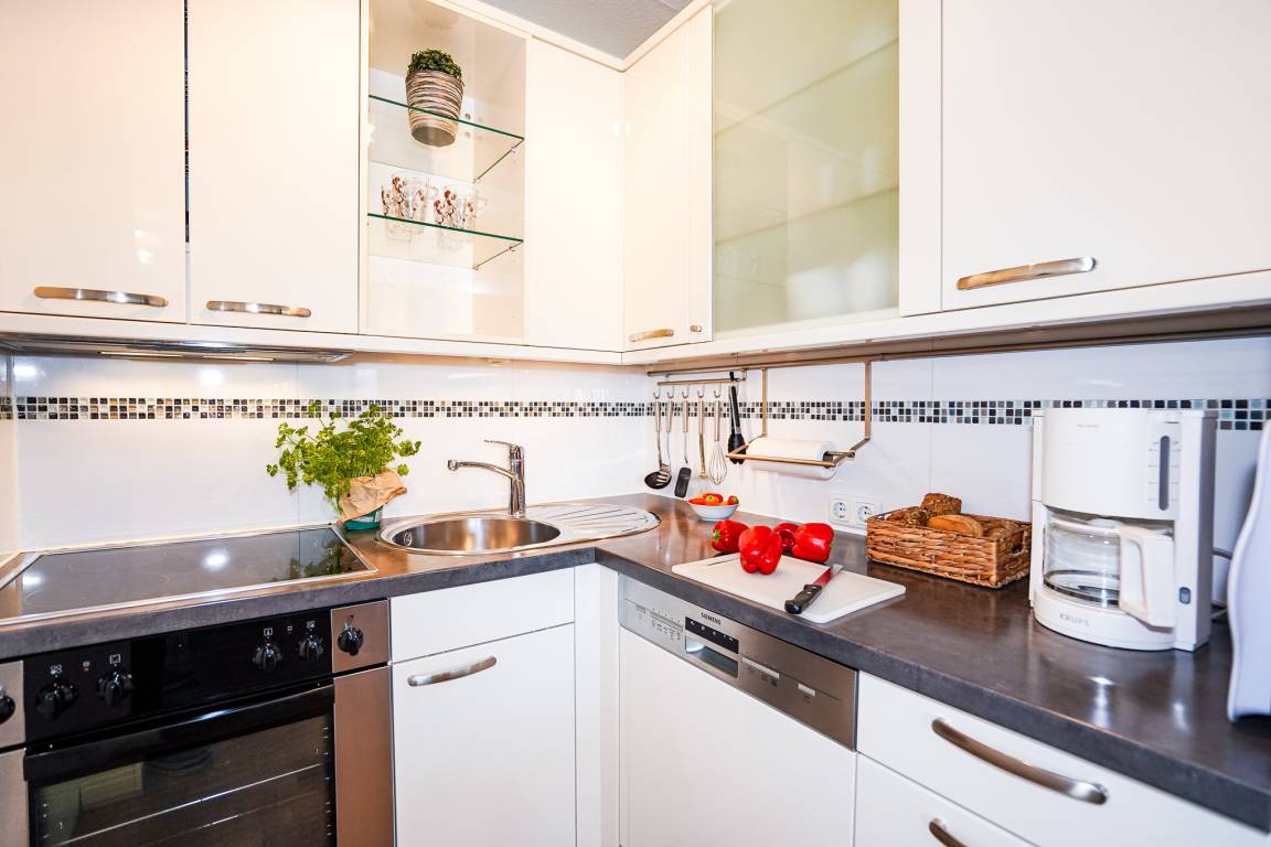 Die moderne Küche verfügt über einen Backofen, Cerankochfeld, Spülmaschine, Kühlschrank mit Gefrierfach und diverse Elektrokleingeräte.