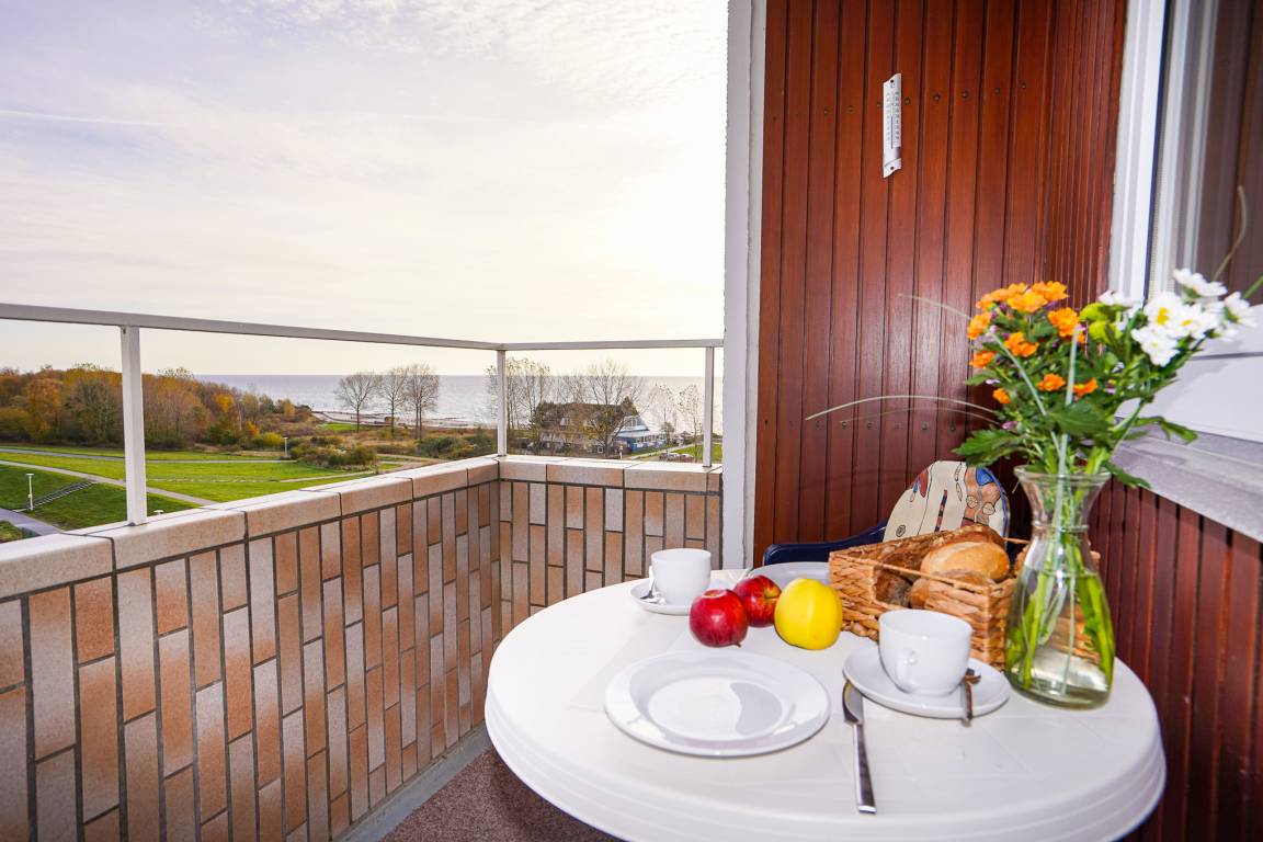 Genießen Sie den traumhaften Blick auf die Ostsee von Ihrem großzügigen Ecksofa, welches um einen bequemen Sessel und einen großen Esstisch ergänzt wird. Hier nehmen Sie Ihre Mahlzeiten ein, ohne den Blick auf das Meer zu verlieren. Zur Unterhaltung stehen Ihnen ein großer Fernseher und natürlich kostenloses W-LAN zur Verfügung. Entspannen Sie nach einem Tag am Strand auf Ihrem Balkon.