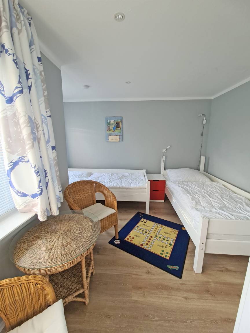 Durch das Elternschlafzimmer, ausgestattet mit einem Doppelbett (90x200) und einem geräumigen Einbaukleiderschrank, gelangen Sie zum Duschbad und den Flur entlang zum 2. Schlafzimmer. Hier stehen Ihnen zwei Einzelbetten (90x200) zur Verfügung.