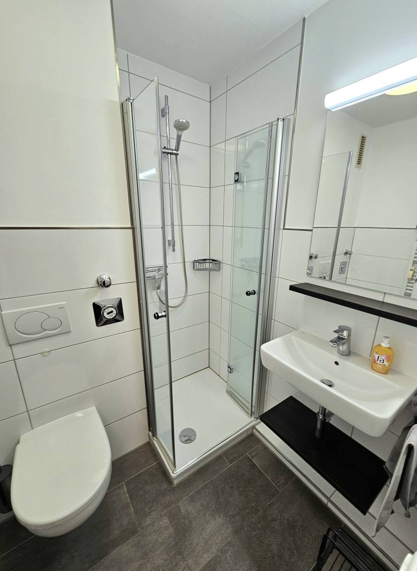 Das Badezimmer ist mit einer Dusche, einem Waschtisch und einem WC modern ausgestattet.