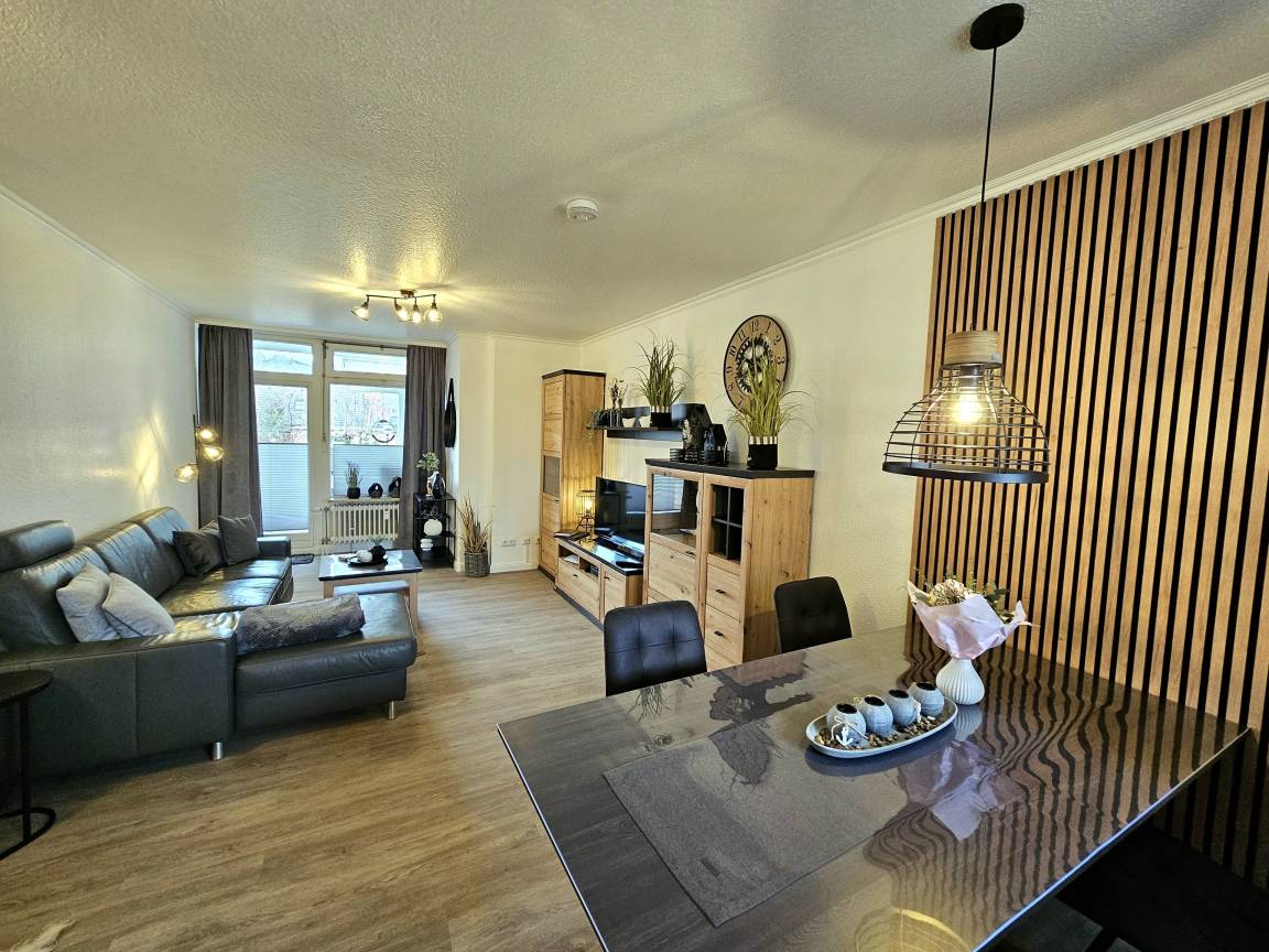 Dank der zentralen Lage direkt hinter dem Deich erreichen Sie die wunderschöne Promenade in nur zwei Gehminuten. Die Wohnung wurde im März 2025 modernisiert und stilvoll ausgestattet. Das gemütliche Wohnzimmer lädt mit einer komfortablen Couchgarnitur, einem TV und einer Essecke zum Verweilen ein. Zwei Balkone, die direkt vom Wohnzimmer aus zugänglich sind, bieten Ihnen die perfekte Möglichkeit, frische Meeresluft zu genießen.
