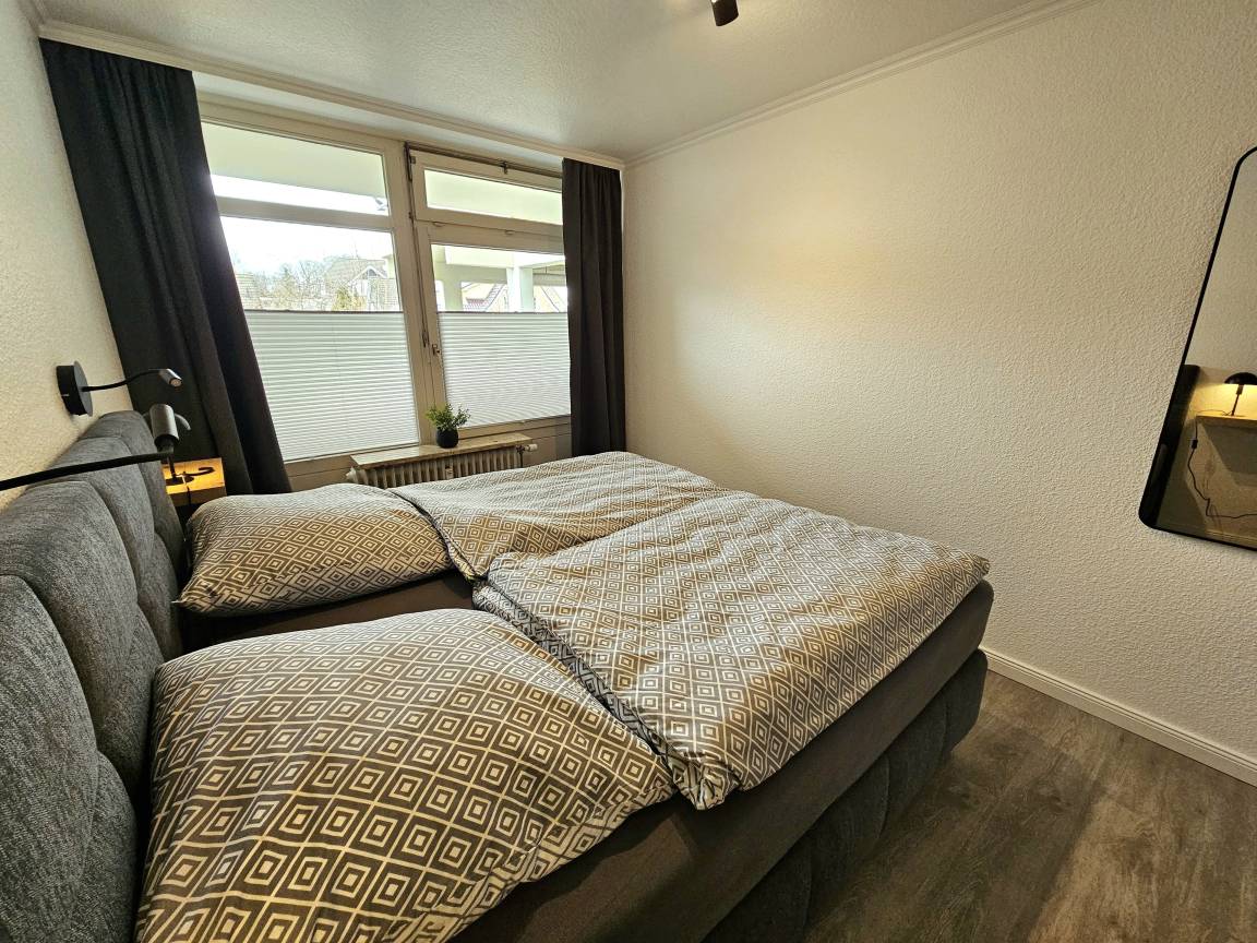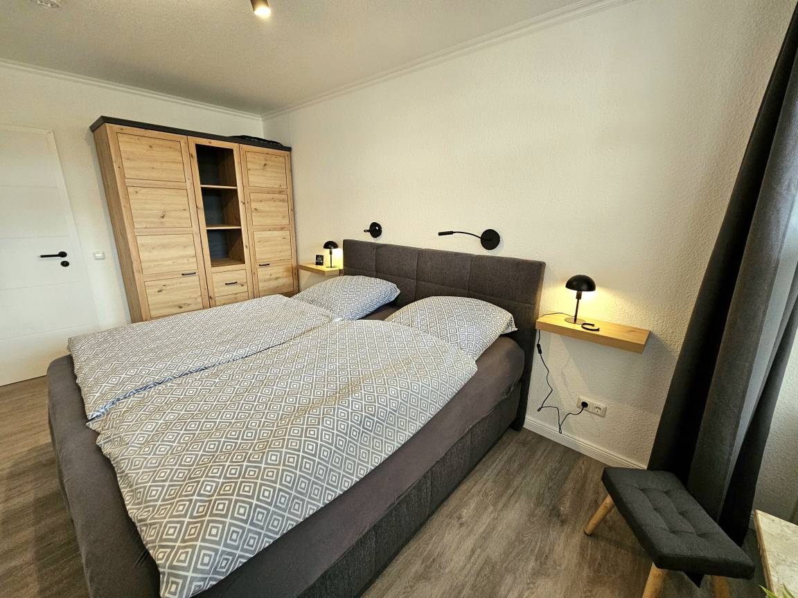 Das Schlafzimmer überzeugt mit einem neuen, bequemen Boxspringbett und einem großzügigen Kleiderschrank - hier finden Sie erholsamen Schlaf nach einem erlebnisreichen Tag.