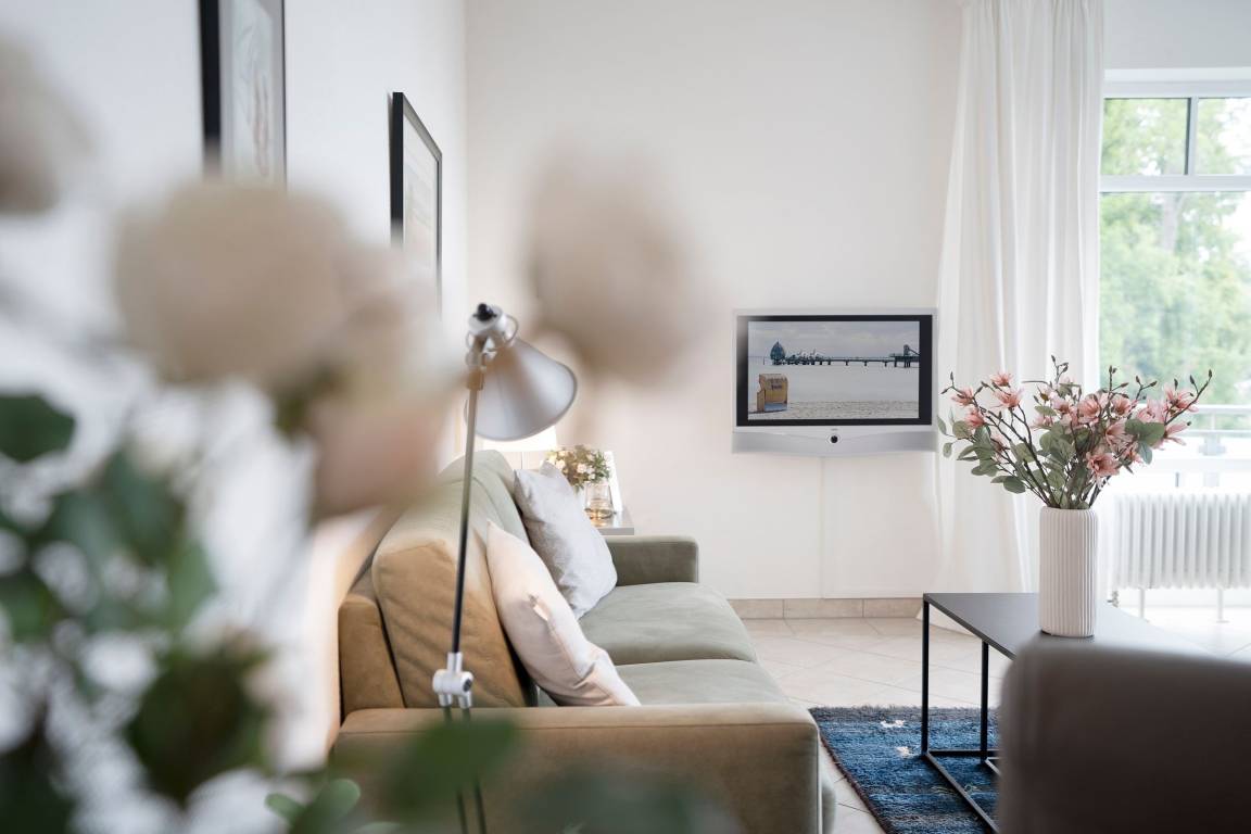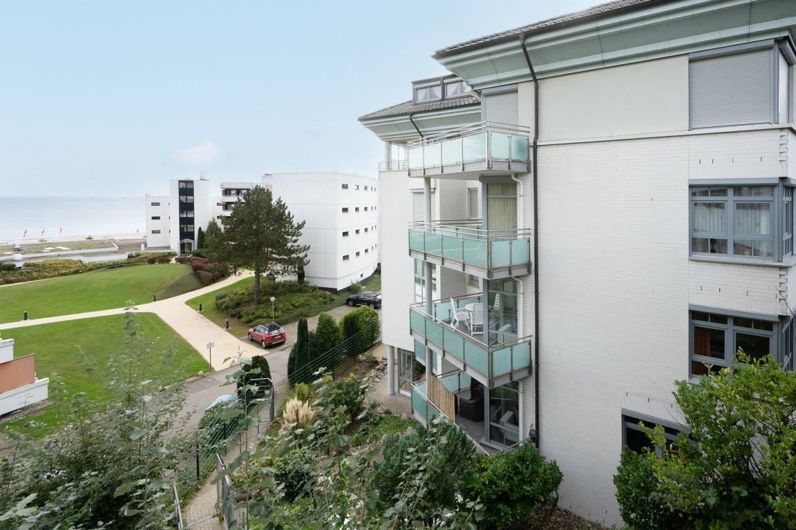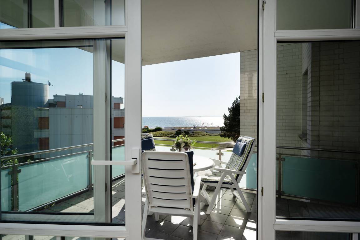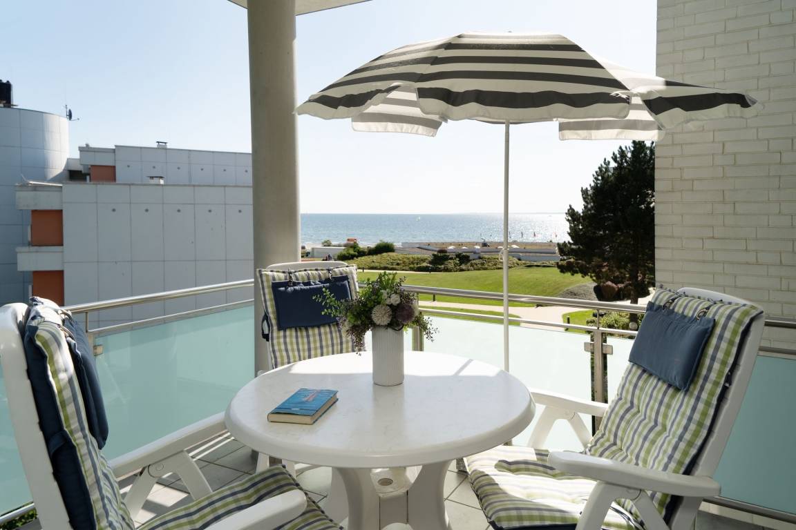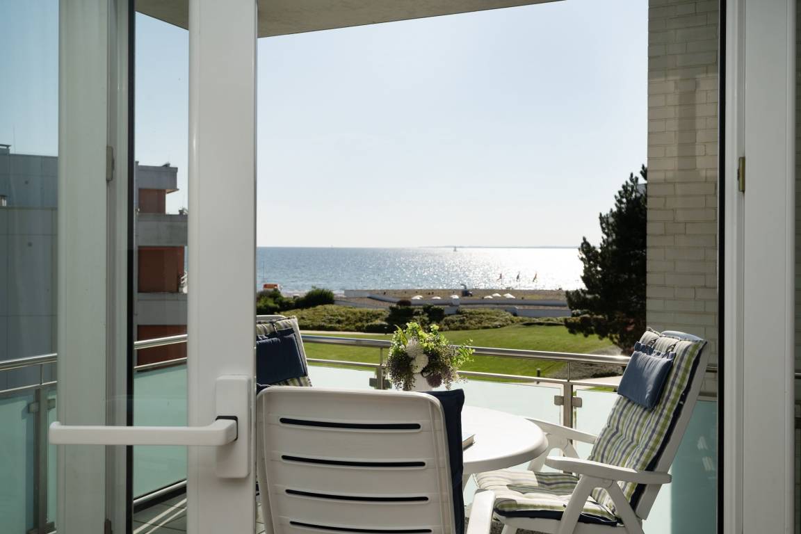 Ferienwohnung in bester Lage von Grömitz: Großzügige 3-Zimmer-Ferienwohnung im 2. Stock mit Balkon und Meerblick sowie einer Wohnfläche von ca. 76 m² für bis zu 3 Personen.