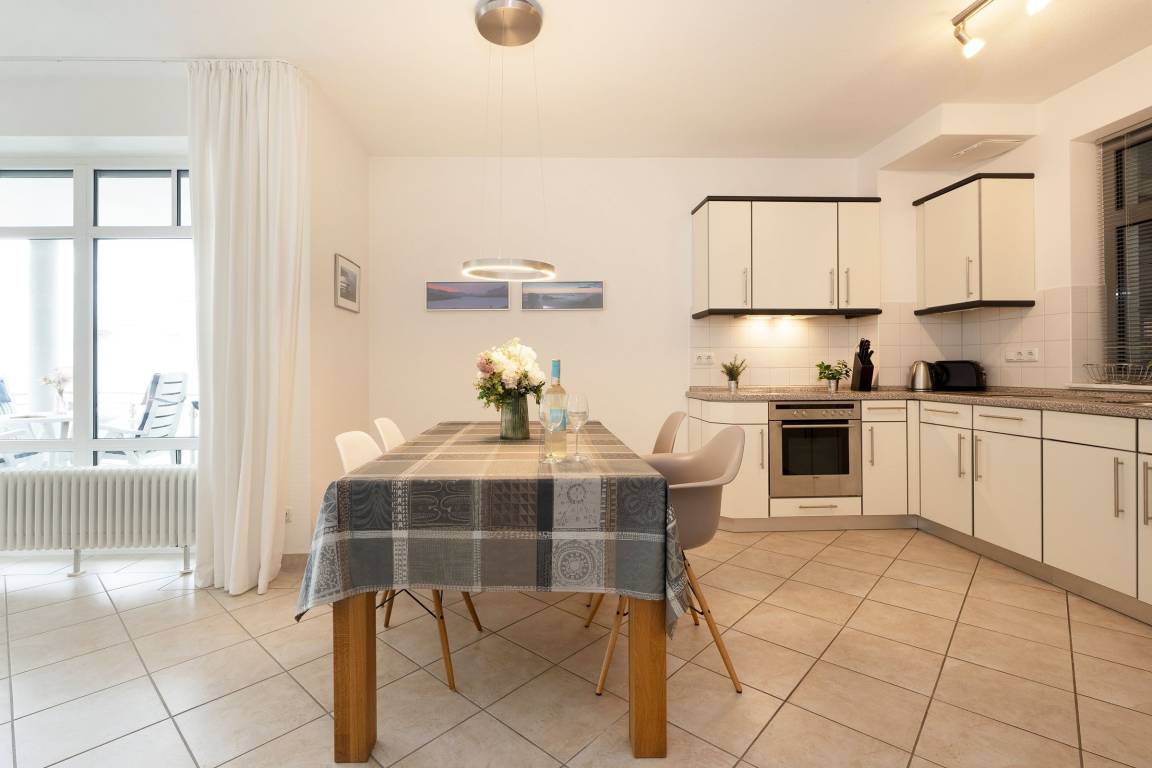 Genießen Sie den traumhaften Meerblick vom Balkon - Dank der Überdachung können Sie den Balkon auch bei nicht so gutem Wetter gemütlich und geschützt nutzen. Das geschmackvoll ausgestattete Wohnzimmer mit kuscheliger Sofalandschaft bietet zudem viel Platz zum Entspannen. Der Flachbildschirm und die Stereo-Anlage mit CD-Player sowie ein Design- Bluetooth Lautsprecher ermöglichen Ihnen die passende Urlaubsunterhaltung. Bereiten Sie in der gut ausgestatteten Küche Ihre Lieblingsspeisen zu oder genießen Sie einen Kaffee aus der Kapselmaschine. Das Schlafzimmer mit Doppelbett (2x 90x200 cm) sowie ein weiteres Schlafzimmer mit einem Einzelbett (90x200 cm) und einem zweiten Flachbildschirm-Fernseher garantieren erholsame Nächte. Einen guten Start in den Morgen ermöglicht das gepflegte Badezimmer mit Dusche, WC sowie zwei Waschbecken.
