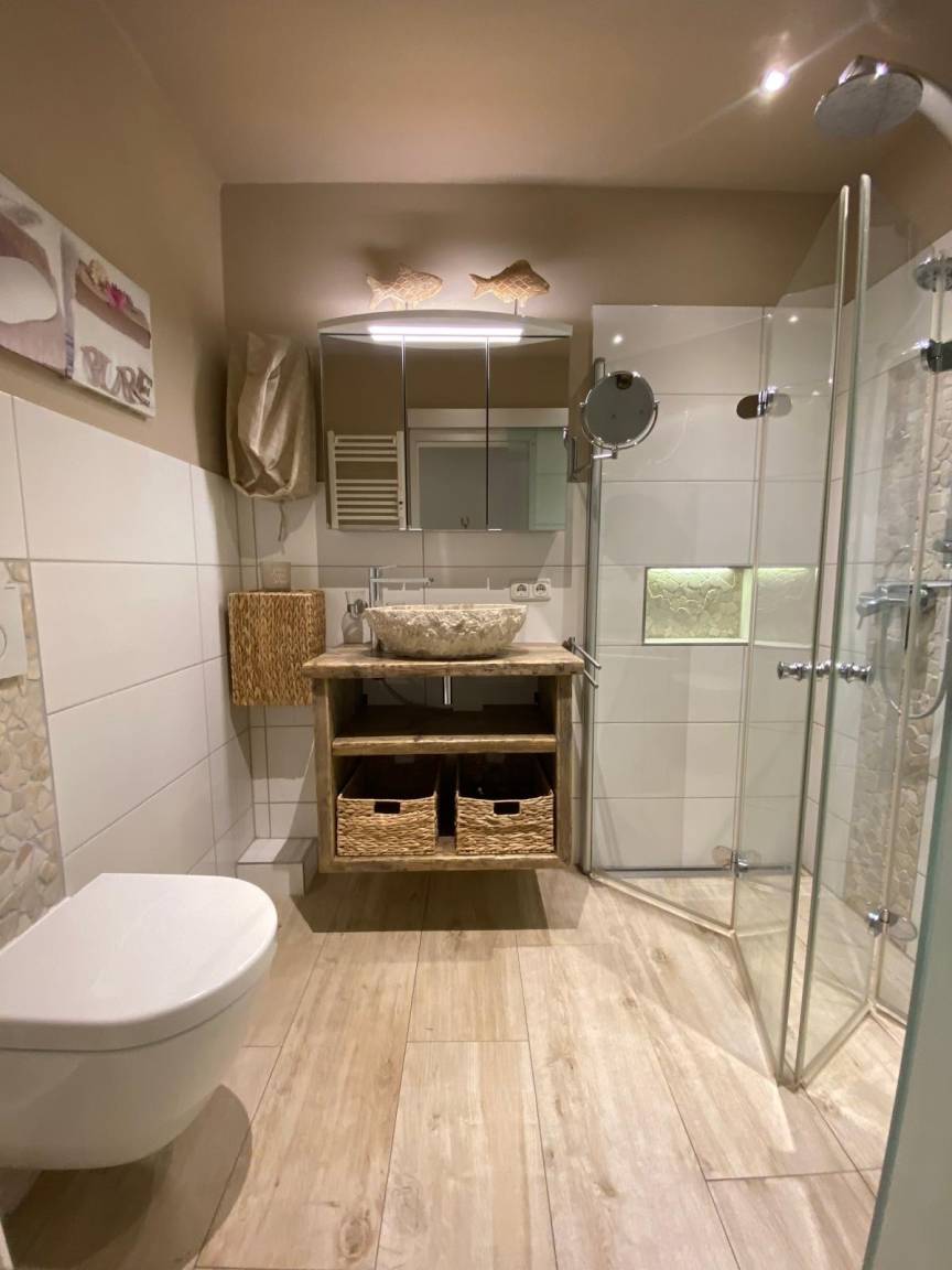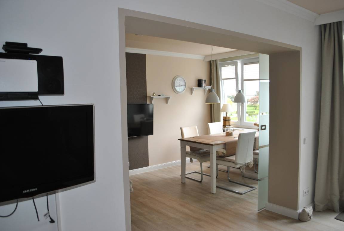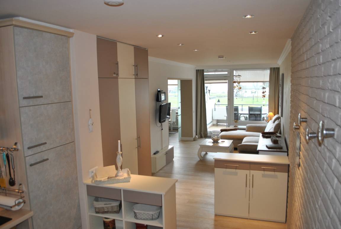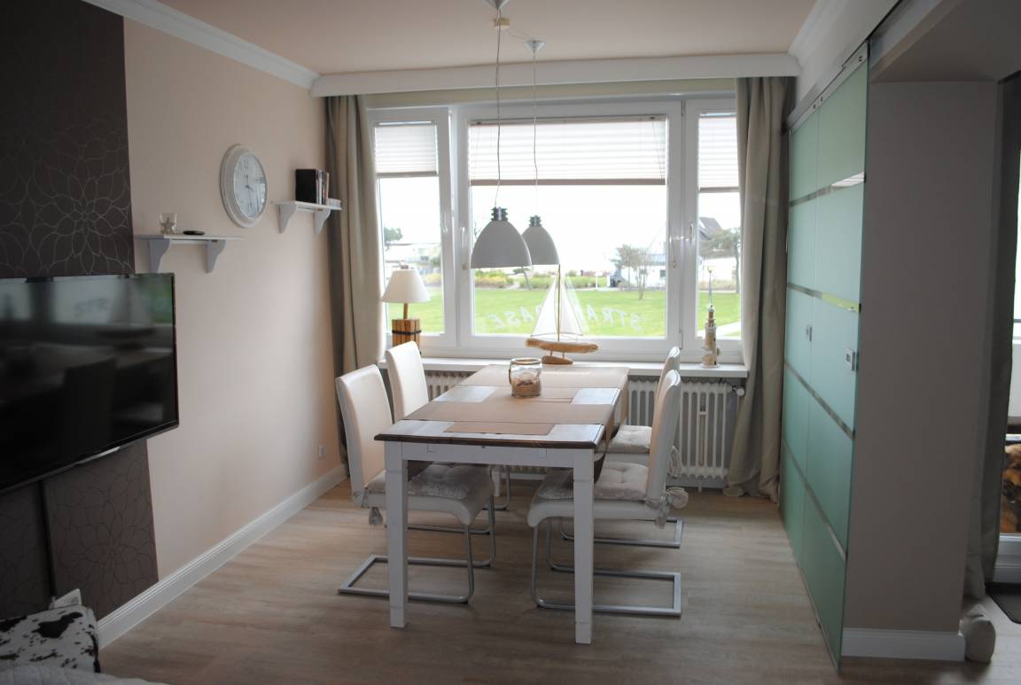 Die lichtdurchflutete "Strandoase" (Nr. 2.08) liegt in der 2. Etage (Aufzug vorhanden) und bietet viel Platz für bis zu 4 Personen. Die Wohnfläche der ca. 58 m² großen Ferienwohnung verteilt sich auf eine offene Küche - Herd (Ceranfeld) mit Backofen, ein Kühlschrank mit Gefrierfach, ein Geschirrspüler und div. Kleinküchengeräte sowie dem angrenzenden großzügigen Wohnzimmer. Vom Wohnzimmer aus haben Sie Zugang zum möblierten Seeblickbalkon und den Esszimmerbereich - mit Blick auf 's Meer. Der Schlafbereich (1,60er x 2,00m Doppelbett mit Boxspringmatratzen) ist durch eine Glasschiebetür zum Wohnzimmer getrennt, sodass immer ein wohliger Rückzugsort geboten ist. Des weiteren verfügt die Wohnung über ein weiteres, separates Schlafzimmer mit einem Etagenbett (90 x 2 m) für 2 Erwachsene oder Kinder. In diesem Zimmer kann bequem auch ein Kinderreisebett zusätzlich aufgestellt werden, dass bei Bedarf kostenlos zur Verfügung gestellt wird. Die Wohnung "Strandoase" ist mit kostenfreiem WLAN 3 Fernsehgeräten inkl. 1 DVD-Player ausgestattet, so dass auch bei schlechtem Wetter im Urlaub ausgewählte Filme oder Sportsendungen zum Entspannen einladen! Das schöne Badezimmer ist mit einer ebenerdigen Dusche von 1,10m x 0,90m und einem geräumigen Waschtisch ausgestattet.