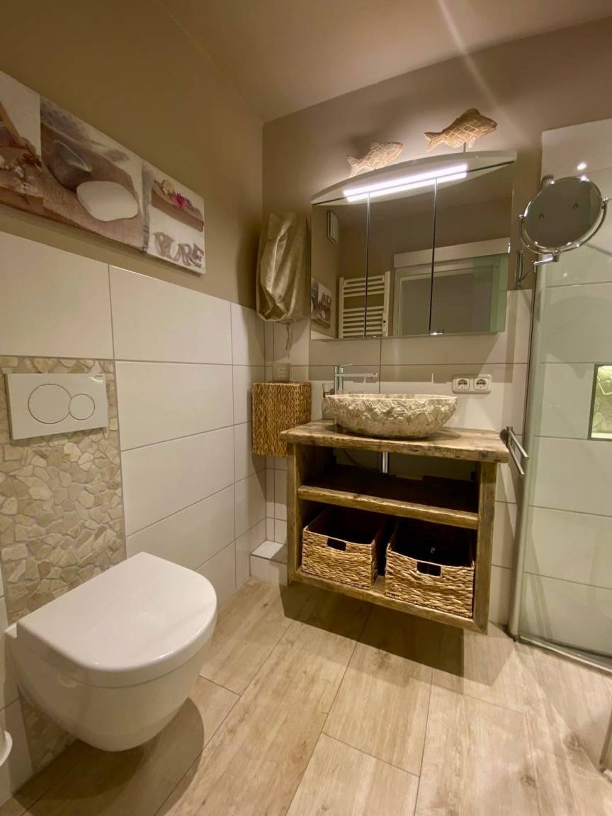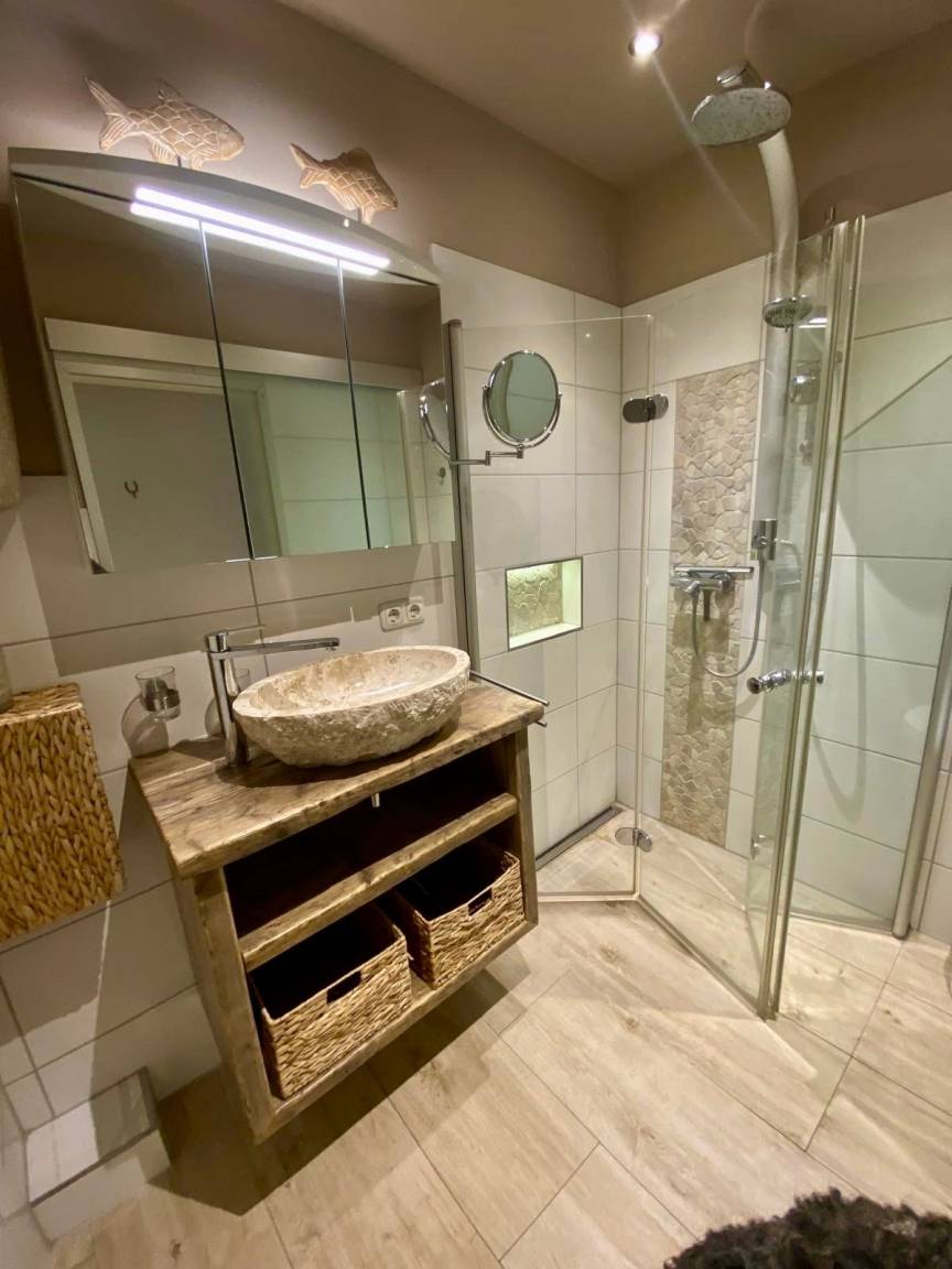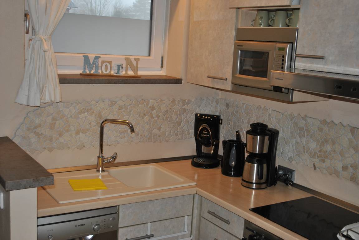 Die lichtdurchflutete "Strandoase" (Nr. 2.08) liegt in der 2. Etage (Aufzug vorhanden) und bietet viel Platz für bis zu 4 Personen. Die Wohnfläche der ca. 58 m² großen Ferienwohnung verteilt sich auf eine offene Küche - Herd (Ceranfeld) mit Backofen, ein Kühlschrank mit Gefrierfach, ein Geschirrspüler und div. Kleinküchengeräte sowie dem angrenzenden großzügigen Wohnzimmer. Vom Wohnzimmer aus haben Sie Zugang zum möblierten Seeblickbalkon und den Esszimmerbereich - mit Blick auf 's Meer. Der Schlafbereich (1,60er x 2,00m Doppelbett mit Boxspringmatratzen) ist durch eine Glasschiebetür zum Wohnzimmer getrennt, sodass immer ein wohliger Rückzugsort geboten ist. Des weiteren verfügt die Wohnung über ein weiteres, separates Schlafzimmer mit einem Etagenbett (90 x 2 m) für 2 Erwachsene oder Kinder. In diesem Zimmer kann bequem auch ein Kinderreisebett zusätzlich aufgestellt werden, dass bei Bedarf kostenlos zur Verfügung gestellt wird. Die Wohnung "Strandoase" ist mit kostenfreiem WLAN 3 Fernsehgeräten inkl. 1 DVD-Player ausgestattet, so dass auch bei schlechtem Wetter im Urlaub ausgewählte Filme oder Sportsendungen zum Entspannen einladen! Das schöne Badezimmer ist mit einer ebenerdigen Dusche von 1,10m x 0,90m und einem geräumigen Waschtisch ausgestattet.