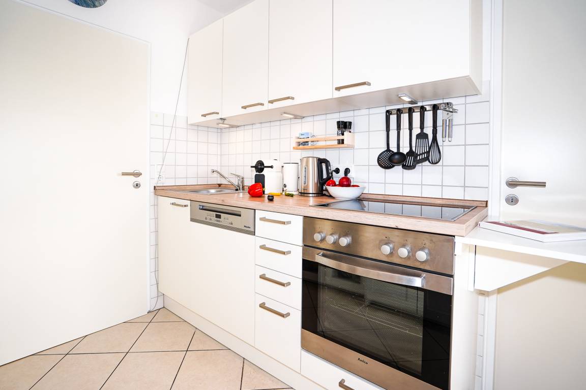 Die voll ausgestattete Küche verfügt über eine Spülmaschine, Backofen, Cerankochfeld und einen Kühlschrank mit Gefrierfach.