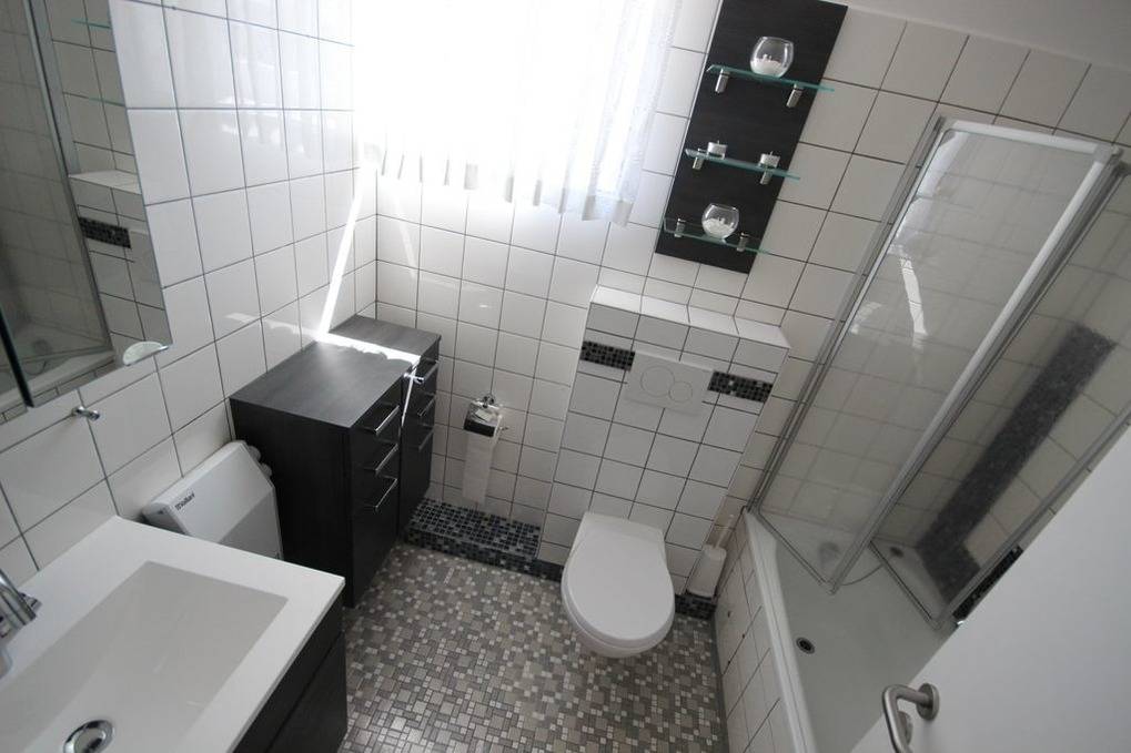Modernes Bad mit Badewanne incl. Duschwand, Waschbecken und WC.
