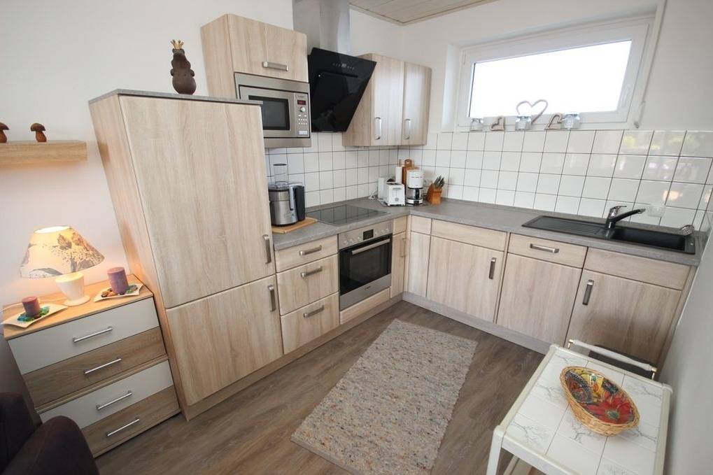 Die im Wohnbereich integrierte Einbauküche ist mit E-Herd, Backofen-Cerankochfeld, Abzugshaube, Kühlschrank, Mikrowelle, Geschirrspülmaschine und den üblichen Küchengeräten sehr gut ausgestattet.