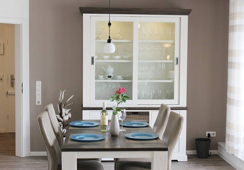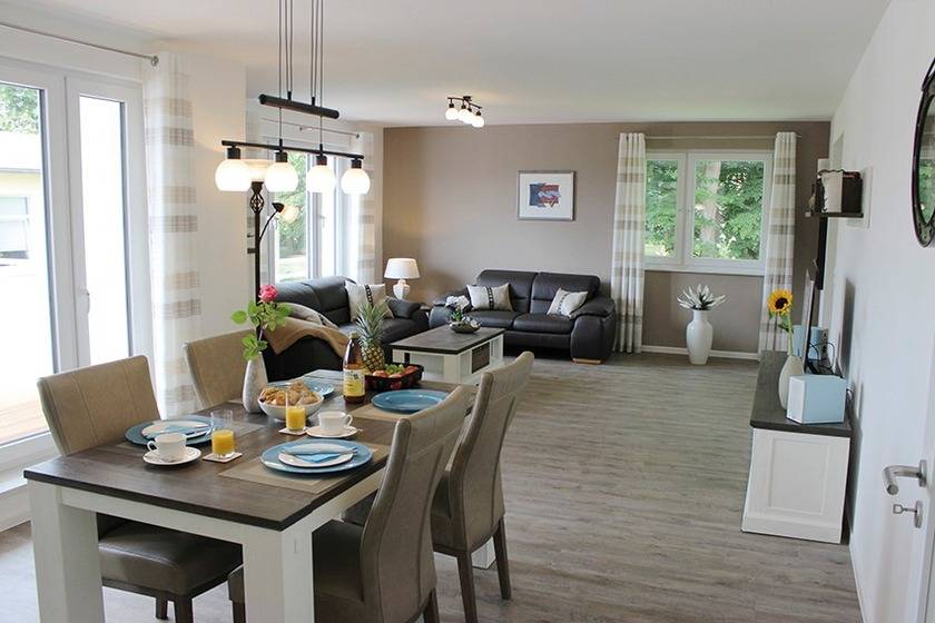 Der großzügige Wohn-, Ess- und Küchenbereich mit ausziehbaren Esstisch gehen harmonisch ineinander über. Die Einrichtung im Landhausstil wird Sie begeistern - die Camargue lässt grüßen!