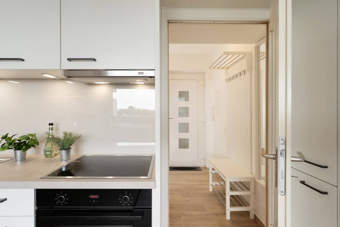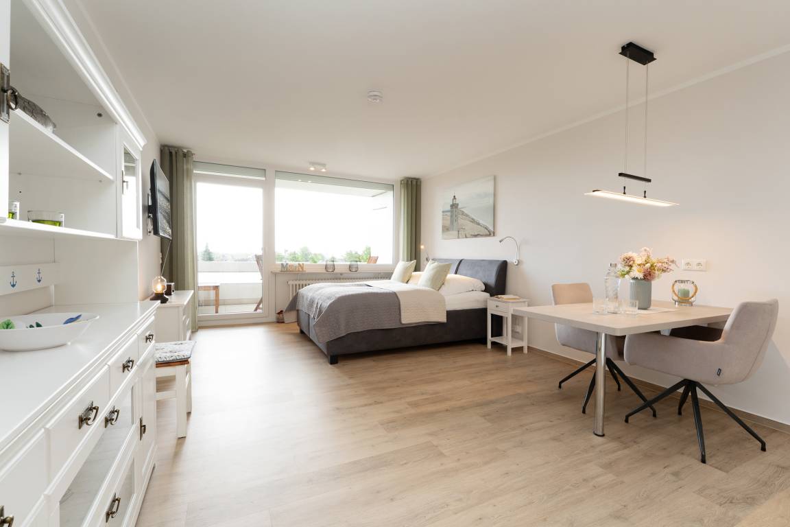 Freundliche 1-Zimmer-Ferienwohnung für 2 Personen in der 3. Etage der Appartementanlage Driftberg im Haus C mit offen gestaltetem Wohn-/Schlafbereich, integrierter Küche und direktem Balkonzugang.