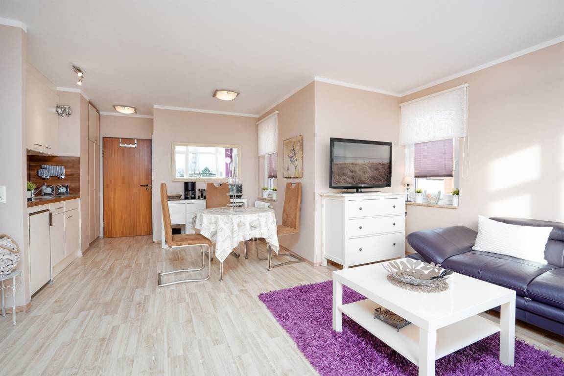 Im Wohnbereich finden Sie neben der gemütlichen Sitzecke ein komfortables Schrankbett (2x 80x200 cm) für zwei Personen, welches für erholsame Nächte sorgt. Hier befindet sich auch eine Essecke für entspannte Abendessen, oder Sie genießen Ihre Freizeit auf dem möblierten Balkon mit Markise und herrlichem Weitblick über das Meer. Ebenso gibt es in der Wohnung eine kleine Küchenzeile, die zum zubereiten leckerer Speisen dient. Selbstverständlich befindet sich auch ein kleines Duschbad in diesem Appartement. Es fehlt Ihnen hier an Nichts...