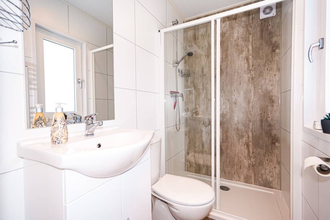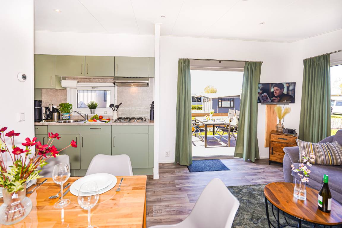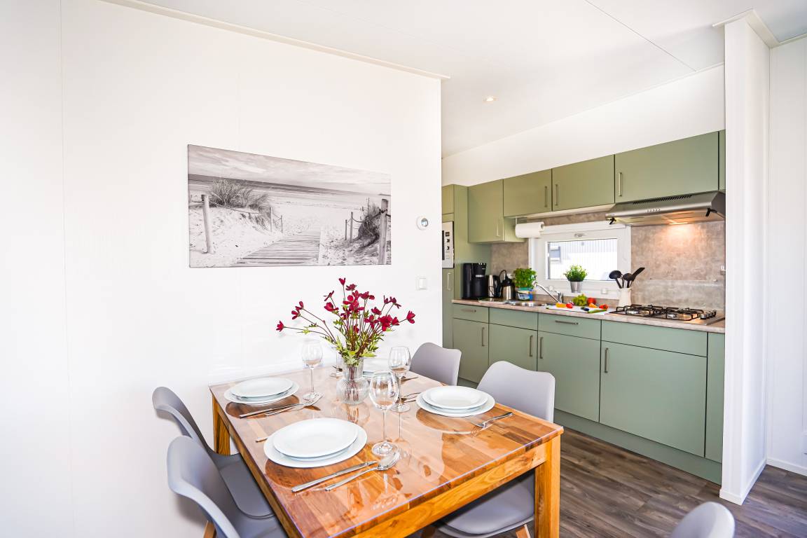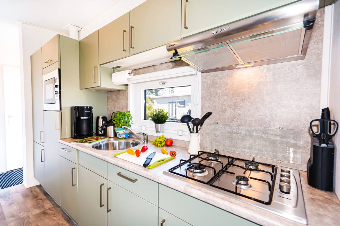 Diese gemütlichen Unterkünfte bieten Platz für bis zu 4 Personen und sind perfekt für einen entspannten Urlaub. Jedes Mobilheim verfügt über eine voll ausgestattete Küche mit Gasherd und Mikrowelle, Kühl- und Gefrierkombination, Geschirrspüler, Kaffeemaschine und Wasserkocher. Ein modernes Badezimmer mit Dusche, WC und Waschtisch sowie zwei einladende Schlafzimmer (ein Doppelbett 2x80x200cm und zwei Einzelbetten 80x200cm) sorgen für Ihren Komfort.