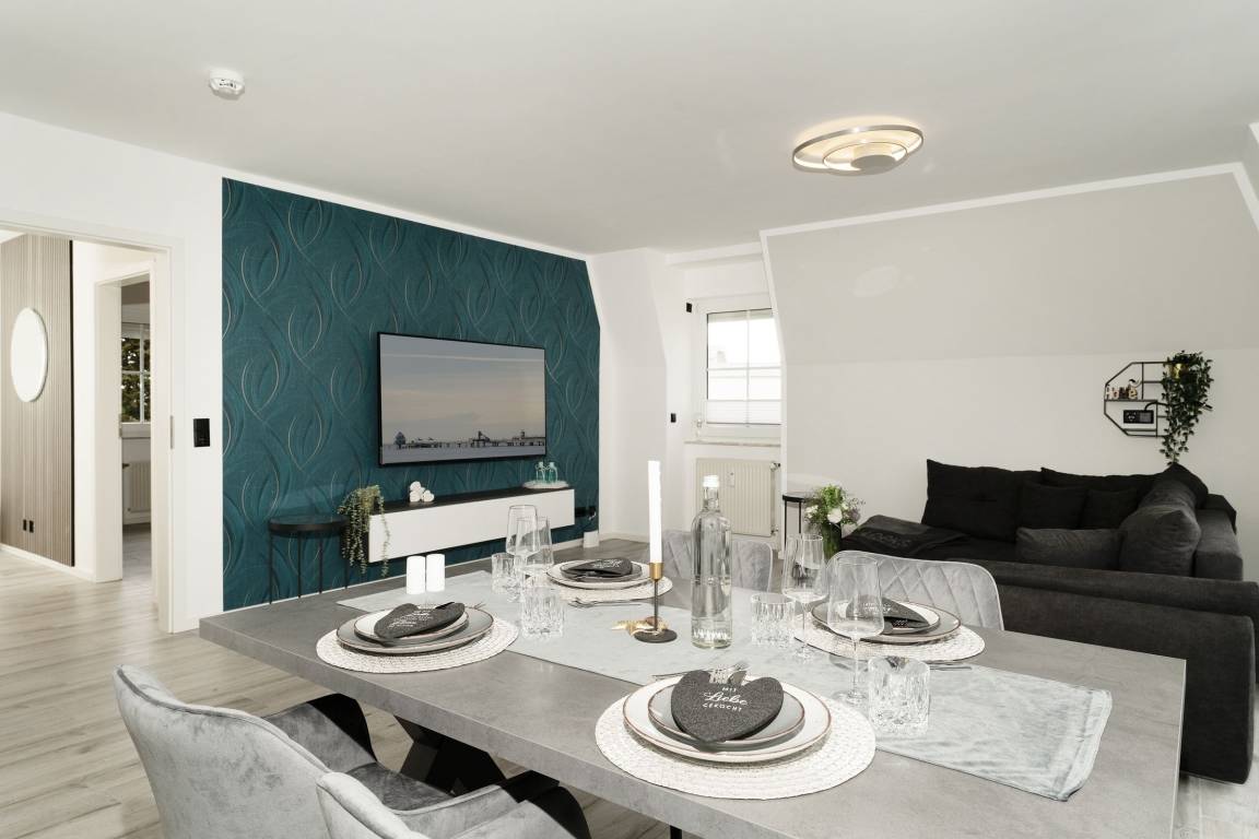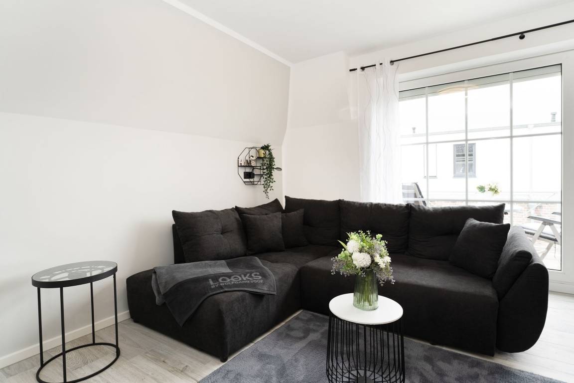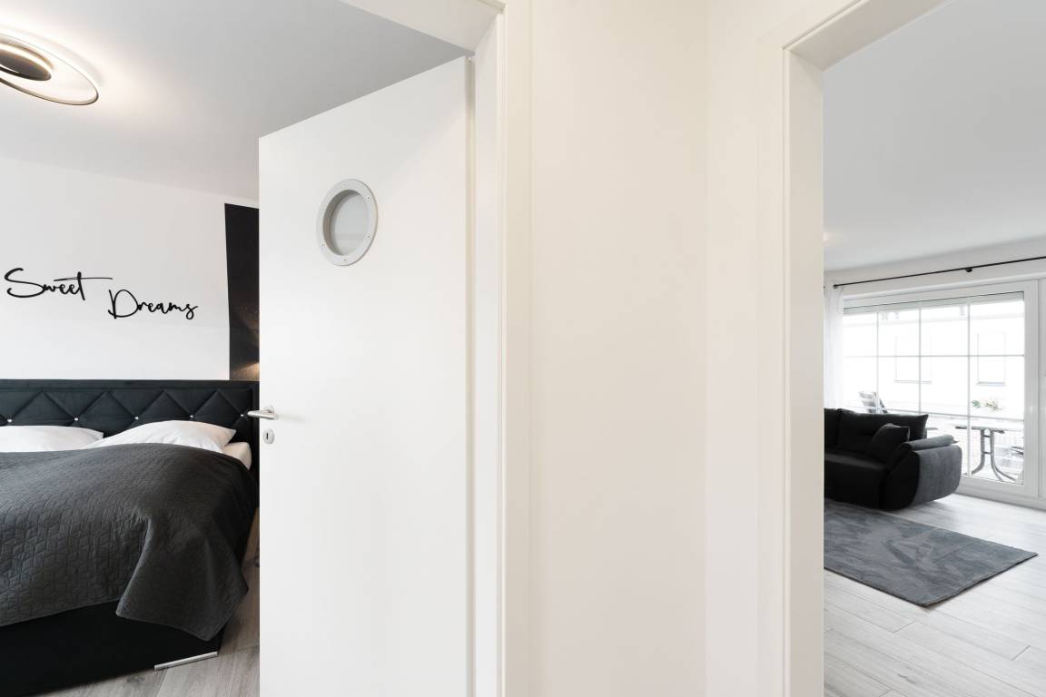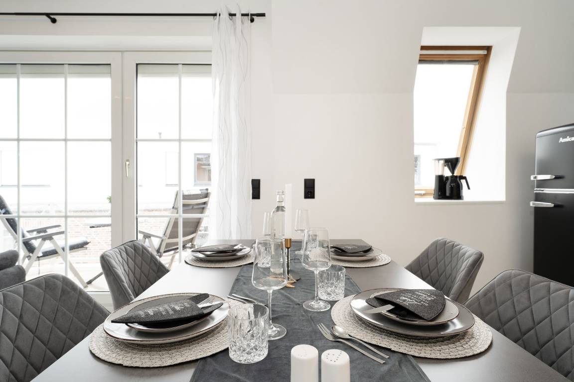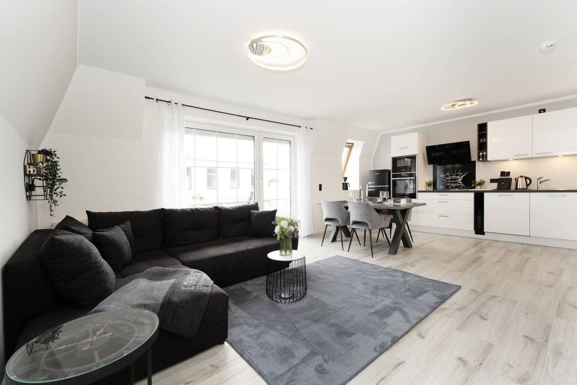 Urlaub der Extraklasse: Hier trifft Qualität auf modernen Schick – die Einrichtung der gesamten Wohnung wurde stilsicher und liebevoll ausgesucht. Vom Flur mit Garderobe und LED-Spiegel können Sie alle Räume betreten. Machen Sie es sich im lichtdurchfluteten Wohnzimmer auf der Sofalandschaft gemütlich und lassen Sie sich musikalisch von Alexa oder dem internetfähigen TV-Gerät unterhalten. Oder genießen Sie ein gutes Buch an der frischen Seeluft auf dem möblierten Balkon mit Sonnenmarkise. Die offene, hochwertig ausgestattete Küche lädt zum gemeinsamen Kochen ein. Neben Extras wie Induktionsherd und Geschirrspüler punktet die Küche mit einem Weinkühlschrank, der 7 Flaschen Ihres Lieblingsweins kühlt. Angenehm nächtigen werden Sie im rückenfreundlichen Boxspring-Doppelbett (180x200 cm) im Schlafzimmer. Zudem lässt sich das Sofa im Wohnbereich in ein komfortables Bett (150x230 cm) verwandeln. Das edle Bad überzeugt mit bodengleicher Dusche und Handtuchwärmer. Praktisch: Verbinden Sie Ihr Handy über Bluetooth mit dem Badezimmerspiegel und starten Sie mit Ihrer Lieblingsmusik in den neuen Urlaubstag.