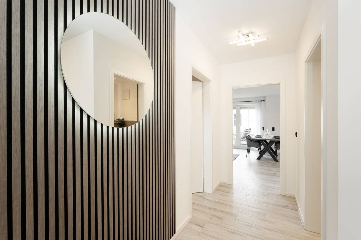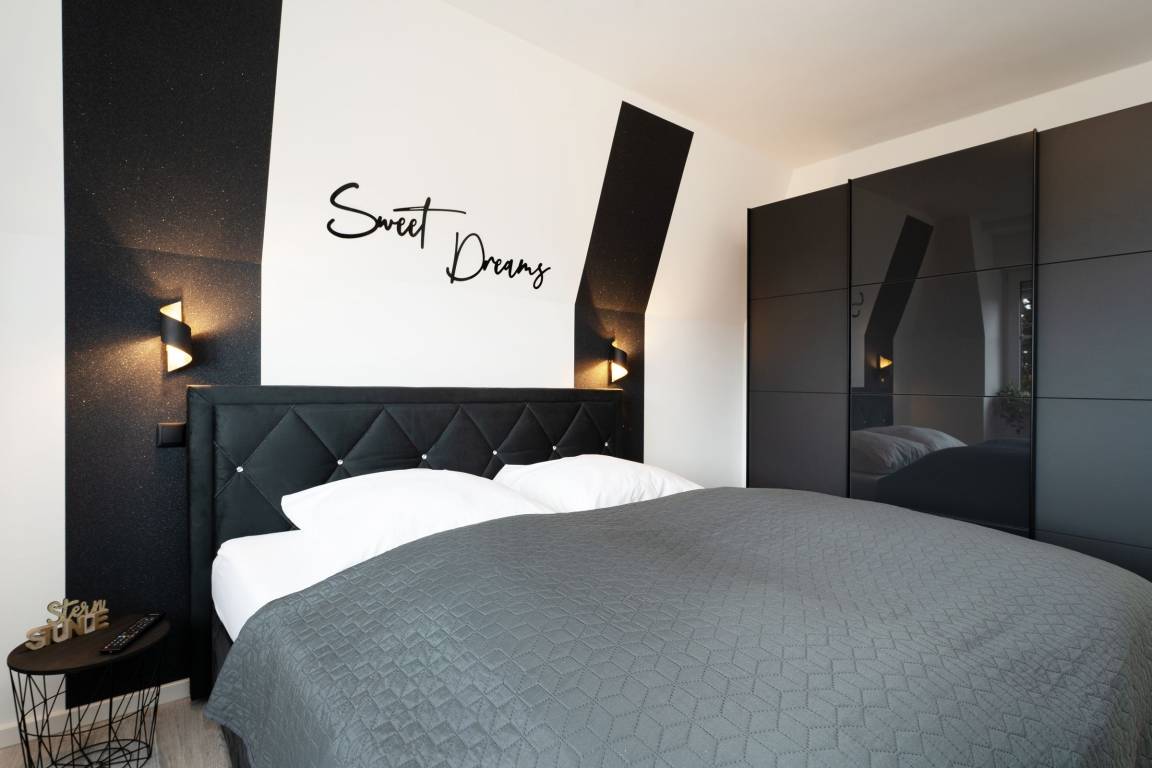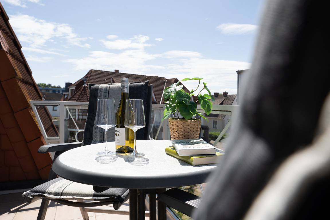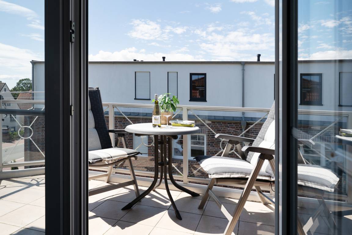 Urlaub der Extraklasse: Hier trifft Qualität auf modernen Schick – die Einrichtung der gesamten Wohnung wurde stilsicher und liebevoll ausgesucht. Vom Flur mit Garderobe und LED-Spiegel können Sie alle Räume betreten. Machen Sie es sich im lichtdurchfluteten Wohnzimmer auf der Sofalandschaft gemütlich und lassen Sie sich musikalisch von Alexa oder dem internetfähigen TV-Gerät unterhalten. Oder genießen Sie ein gutes Buch an der frischen Seeluft auf dem möblierten Balkon mit Sonnenmarkise. Die offene, hochwertig ausgestattete Küche lädt zum gemeinsamen Kochen ein. Neben Extras wie Induktionsherd und Geschirrspüler punktet die Küche mit einem Weinkühlschrank, der 7 Flaschen Ihres Lieblingsweins kühlt. Angenehm nächtigen werden Sie im rückenfreundlichen Boxspring-Doppelbett (180x200 cm) im Schlafzimmer. Zudem lässt sich das Sofa im Wohnbereich in ein komfortables Bett (150x230 cm) verwandeln. Das edle Bad überzeugt mit bodengleicher Dusche und Handtuchwärmer. Praktisch: Verbinden Sie Ihr Handy über Bluetooth mit dem Badezimmerspiegel und starten Sie mit Ihrer Lieblingsmusik in den neuen Urlaubstag.