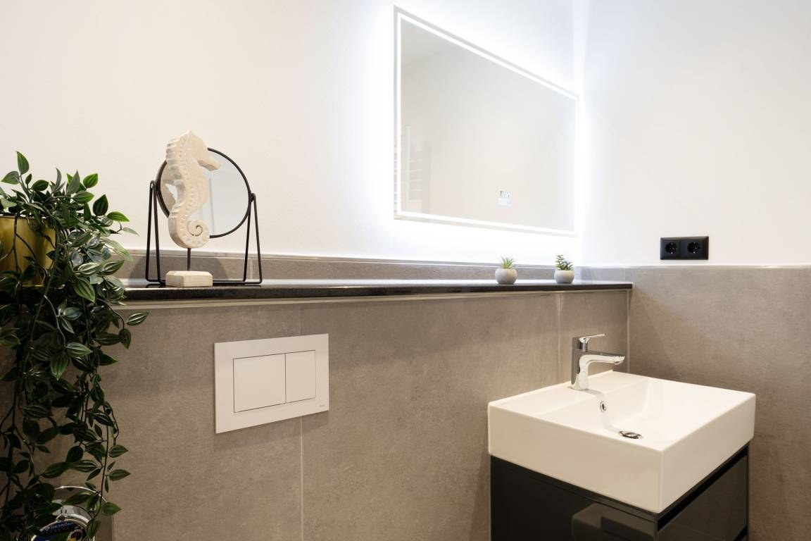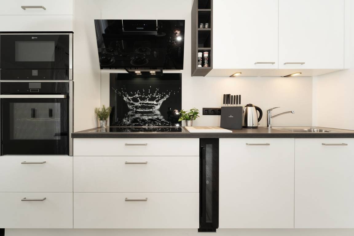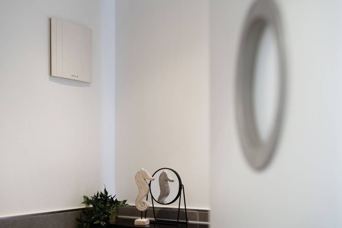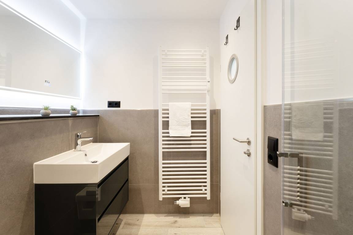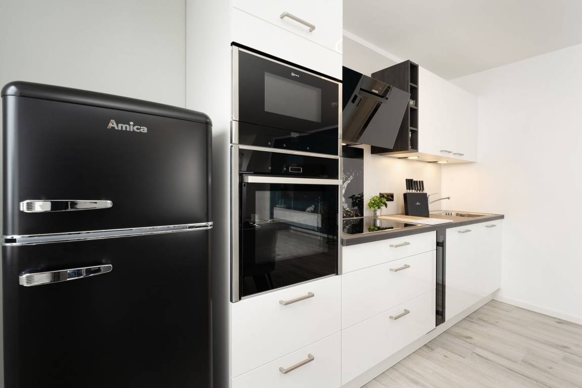 Urlaub der Extraklasse: Hier trifft Qualität auf modernen Schick – die Einrichtung der gesamten Wohnung wurde stilsicher und liebevoll ausgesucht. Vom Flur mit Garderobe und LED-Spiegel können Sie alle Räume betreten. Machen Sie es sich im lichtdurchfluteten Wohnzimmer auf der Sofalandschaft gemütlich und lassen Sie sich musikalisch von Alexa oder dem internetfähigen TV-Gerät unterhalten. Oder genießen Sie ein gutes Buch an der frischen Seeluft auf dem möblierten Balkon mit Sonnenmarkise. Die offene, hochwertig ausgestattete Küche lädt zum gemeinsamen Kochen ein. Neben Extras wie Induktionsherd und Geschirrspüler punktet die Küche mit einem Weinkühlschrank, der 7 Flaschen Ihres Lieblingsweins kühlt. Angenehm nächtigen werden Sie im rückenfreundlichen Boxspring-Doppelbett (180x200 cm) im Schlafzimmer. Zudem lässt sich das Sofa im Wohnbereich in ein komfortables Bett (150x230 cm) verwandeln. Das edle Bad überzeugt mit bodengleicher Dusche und Handtuchwärmer. Praktisch: Verbinden Sie Ihr Handy über Bluetooth mit dem Badezimmerspiegel und starten Sie mit Ihrer Lieblingsmusik in den neuen Urlaubstag.