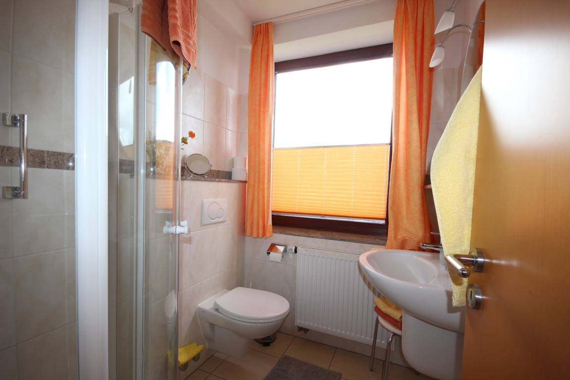Im hell gefliesten Tageslicht-Bad befindet sich eine Duschkabine, Waschbecken und WC.
