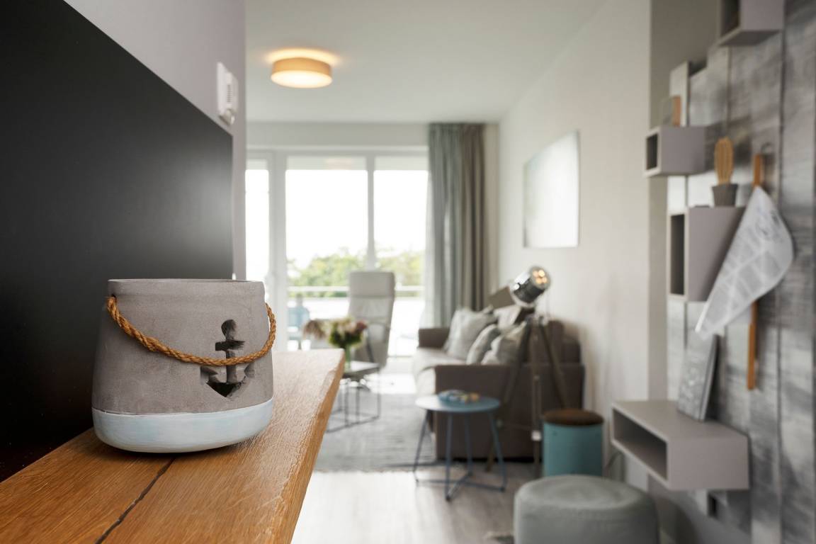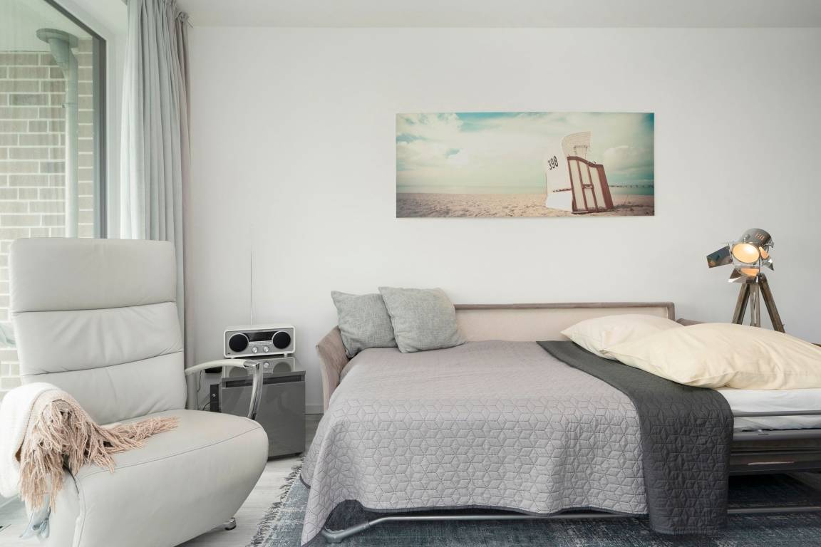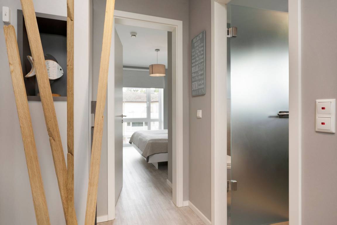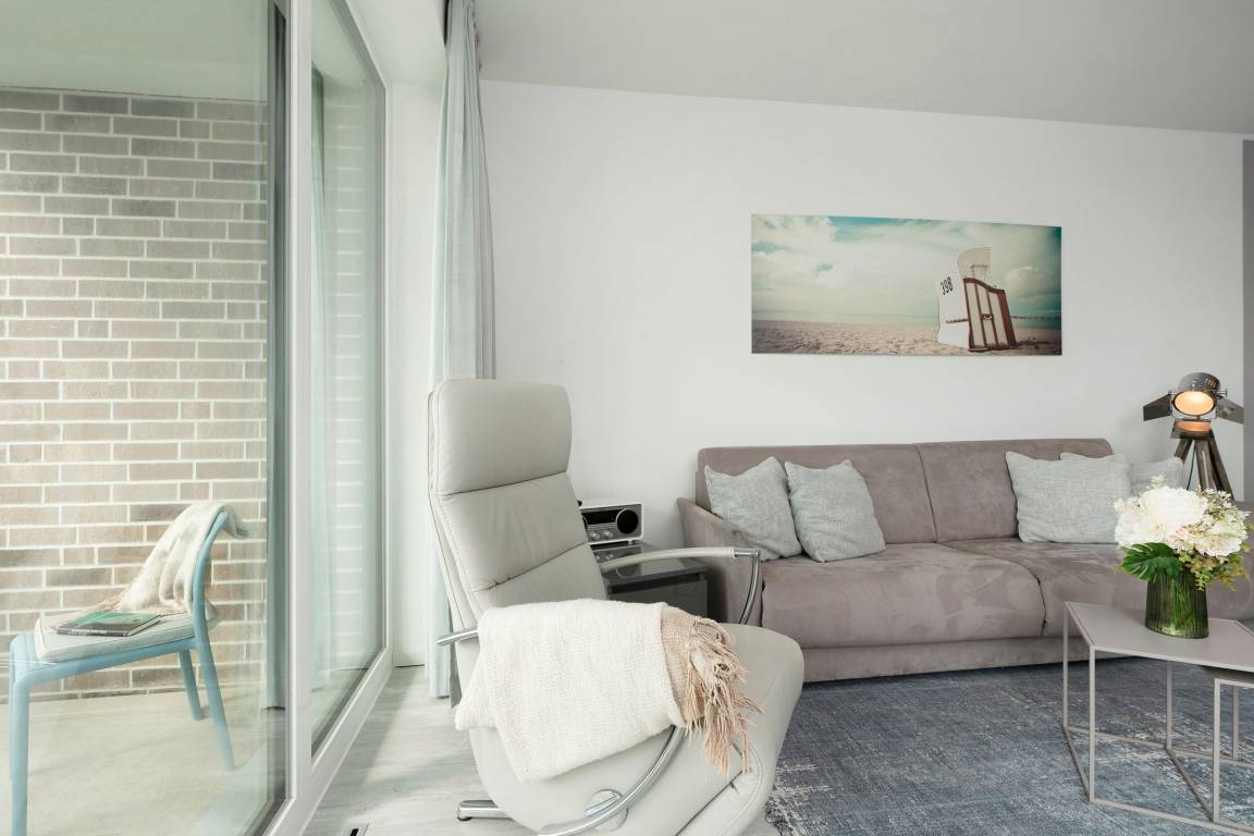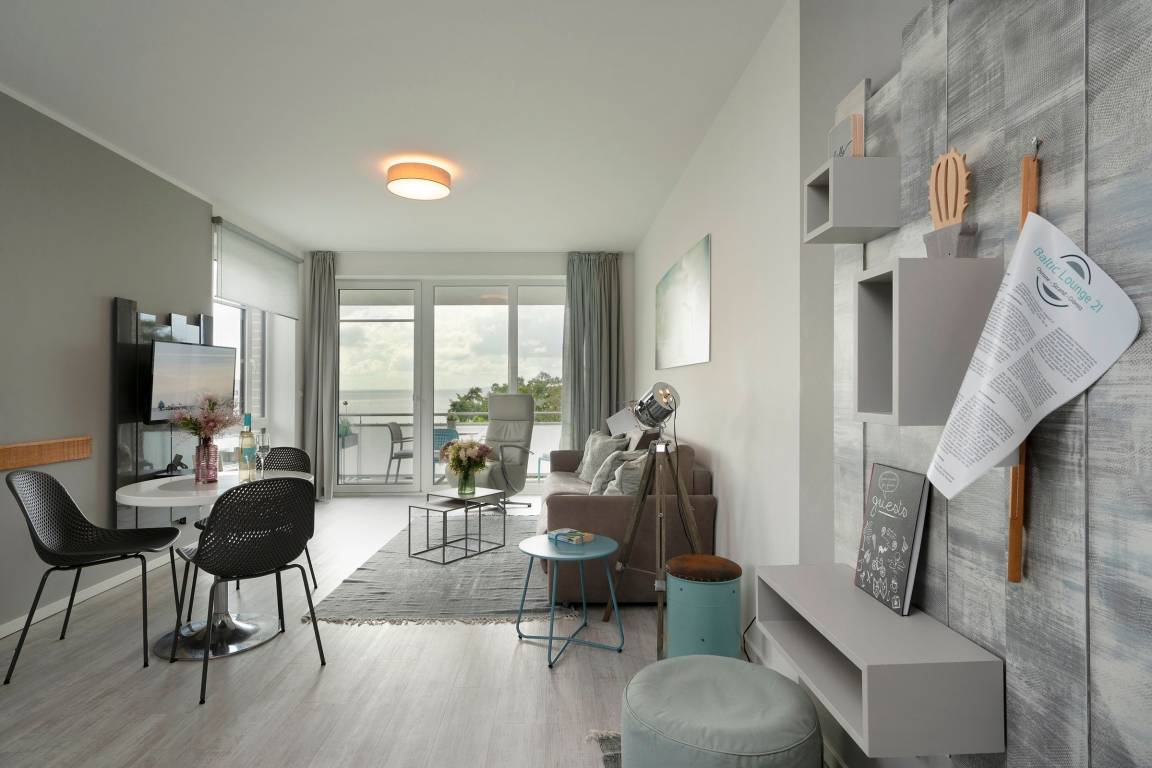 Mit dem Strand nur 200 Meter entfernt kann der Urlaub in der Baltic Lounge 21 so richtig losgehen: Öffnen Sie die Wohnungstür und betreten Sie direkt den hellen, modern eingerichteten Wohn- und Essbereich - Ihre Wohlfühlzone für die kommenden Urlaubstage. Ihr Feriendomizil verfügt über viele stilvolle Designelemente, verfeinert mit einem maritimen Touch. Die Designerküche ist zum Wohnzimmer hin offen und verfügt über alle Annehmlichkeiten, um köstliche Urlaubsleckereien zuzubereiten. Diese können Sie in der angrenzenden Sitzecke direkt genießen. An einem Regentag kann es sich auf der Couch mit Schlaffunktion (140x200 cm) bequem gemacht werden, um auf dem TV die Lieblingsserie zu schauen oder über den Bluetooth-Lautsprecher seiner Urlaubsplaylist zu lauschen. Schreiten Sie vom Wohnzimmer hinaus auf den überdachten Balkon, machen Sie es sich auf den Balkonmöbeln gemütlich und lassen Sie Ihren Blick über die tiefblaue Ostsee schweifen. Das separate Schlafzimmer mit maßangefertigtem Kleiderschrank und geräumigem Doppelbett (180x200 cm) lässt Sie geruhsamen Schlaf finden. Am nächsten Morgen erwartet Sie dann ein kleines Highlight für sich: Das taghelle Duschbad inklusive Fußbodenheizung, großem Kosmetikspiegel und Handtuchwärmer.