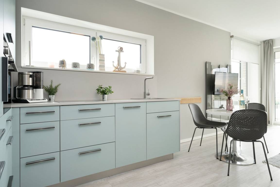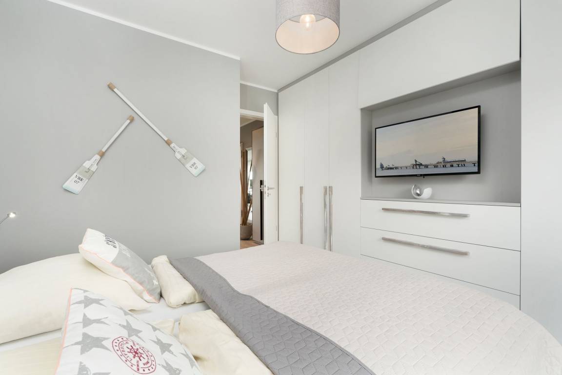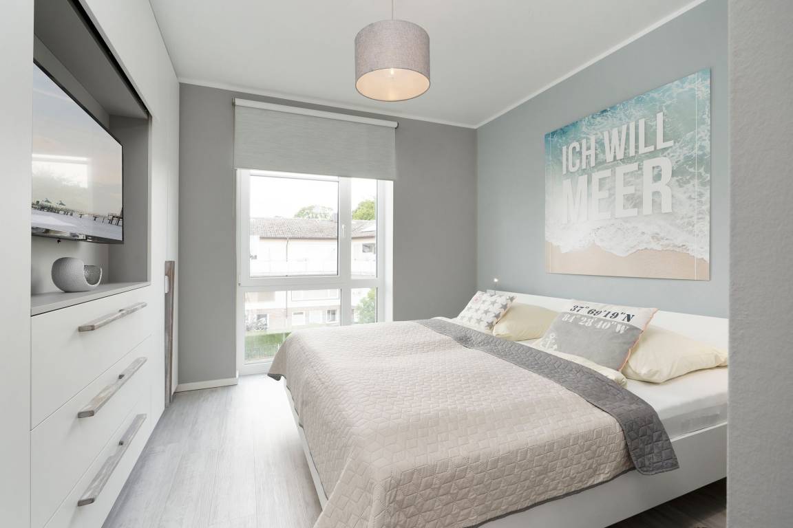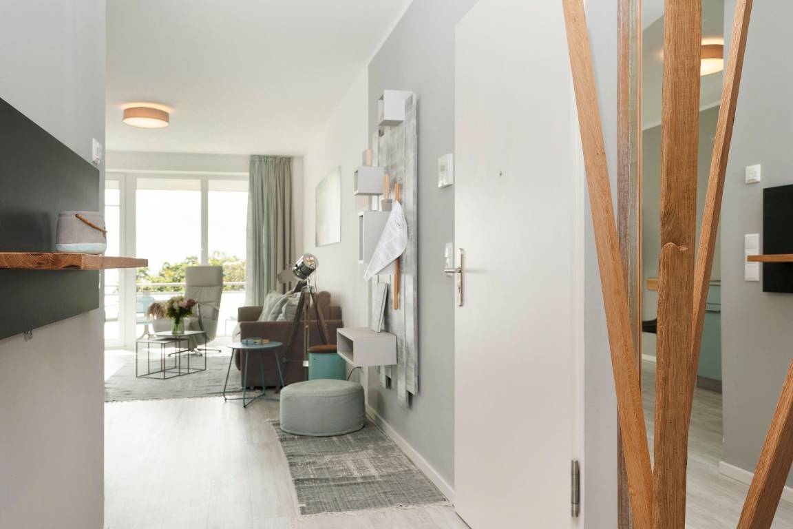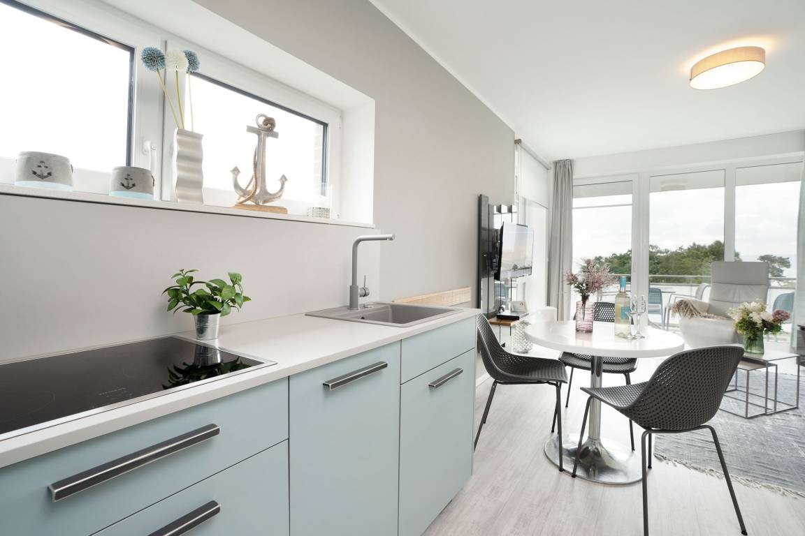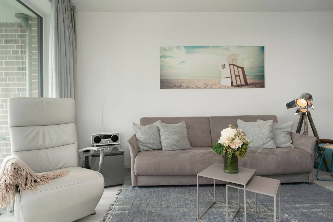 Mit dem Strand nur 200 Meter entfernt kann der Urlaub in der Baltic Lounge 21 so richtig losgehen: Öffnen Sie die Wohnungstür und betreten Sie direkt den hellen, modern eingerichteten Wohn- und Essbereich - Ihre Wohlfühlzone für die kommenden Urlaubstage. Ihr Feriendomizil verfügt über viele stilvolle Designelemente, verfeinert mit einem maritimen Touch. Die Designerküche ist zum Wohnzimmer hin offen und verfügt über alle Annehmlichkeiten, um köstliche Urlaubsleckereien zuzubereiten. Diese können Sie in der angrenzenden Sitzecke direkt genießen. An einem Regentag kann es sich auf der Couch mit Schlaffunktion (140x200 cm) bequem gemacht werden, um auf dem TV die Lieblingsserie zu schauen oder über den Bluetooth-Lautsprecher seiner Urlaubsplaylist zu lauschen. Schreiten Sie vom Wohnzimmer hinaus auf den überdachten Balkon, machen Sie es sich auf den Balkonmöbeln gemütlich und lassen Sie Ihren Blick über die tiefblaue Ostsee schweifen. Das separate Schlafzimmer mit maßangefertigtem Kleiderschrank und geräumigem Doppelbett (180x200 cm) lässt Sie geruhsamen Schlaf finden. Am nächsten Morgen erwartet Sie dann ein kleines Highlight für sich: Das taghelle Duschbad inklusive Fußbodenheizung, großem Kosmetikspiegel und Handtuchwärmer.