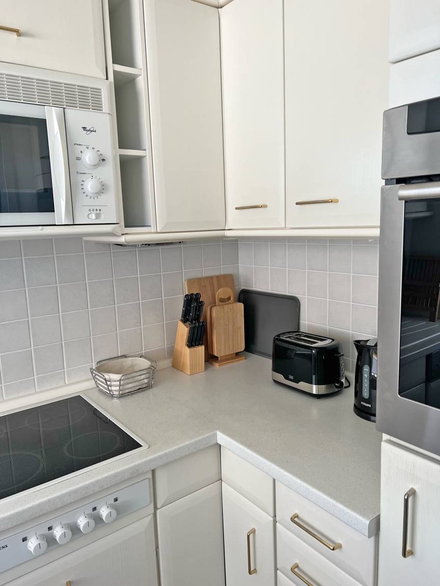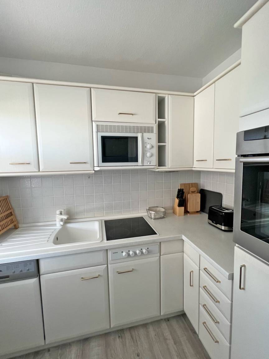 Der Wohnbereich ist als moderne Wohnküche gestaltet und verfügt über eine neue, komplett ausgestattete Einbauküche mit allen notwendigen Küchenutensilien sowie einen Essbereich für bis zu 4 Personen. Ein neues, gemütliches Sofa und ein Flachbildfernseher laden zum Entspannen ein.