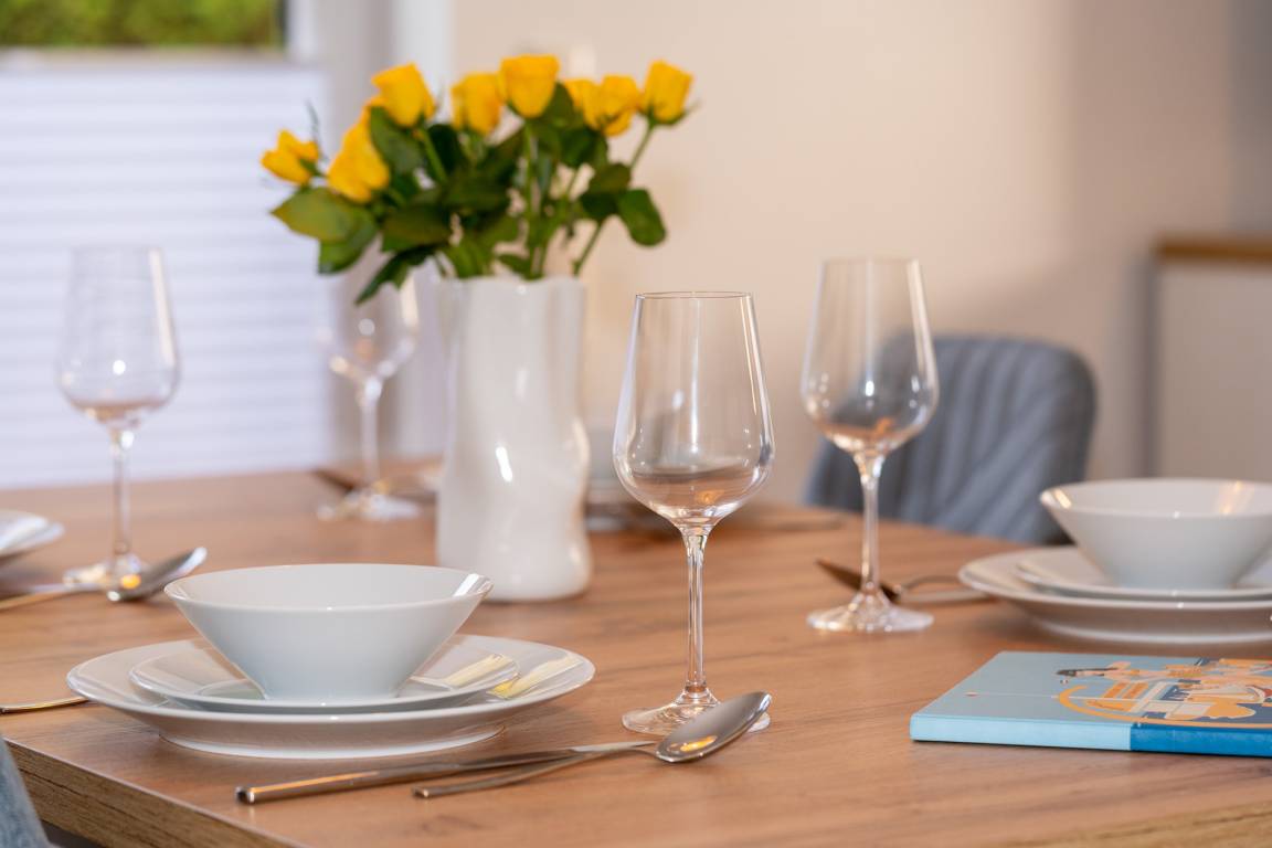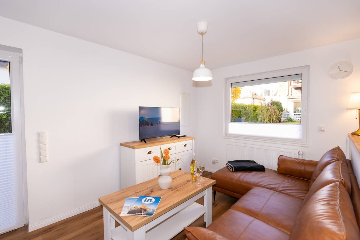 Der Bungalow verfügt über einen sehr hellen und offenen Wohn-/ Essbereich. Hier finden Sie eine große Couch, SAT-TV und und selbstverständlich kostenloses W-LAN vor. Am bodentiefen Fenster befindet sich der Esstisch mit 4 Stühlen Die offene Küche mit Cerankochfeld und Backofen, Spülmaschine, Kühlschrank mit Gefrierfach und Mikrowelle ist perfekt in das Wohnzimmer integriert und lädt zum gemütlichen Beisammensein ein.