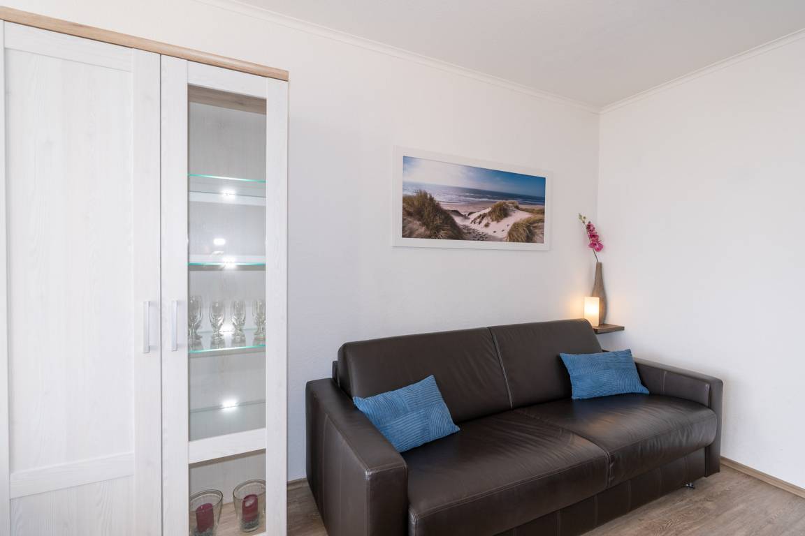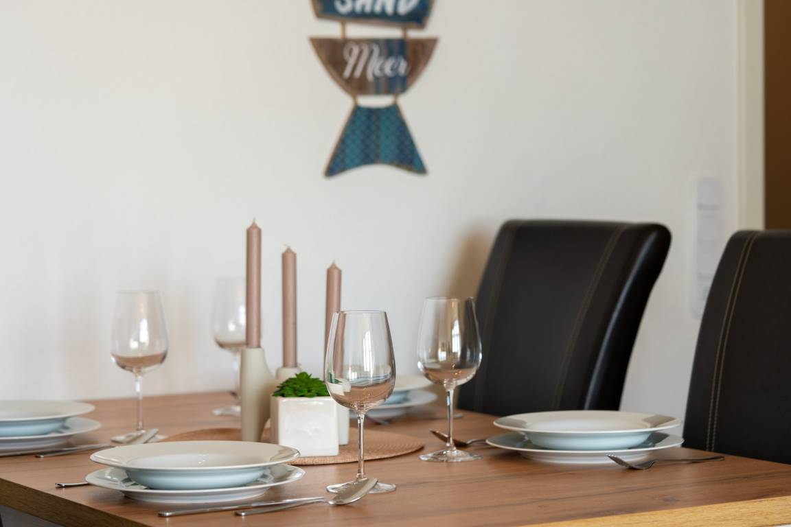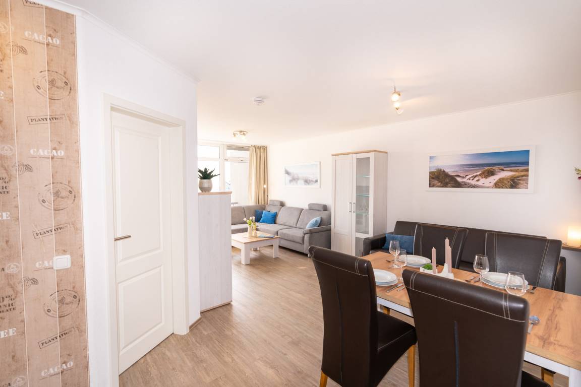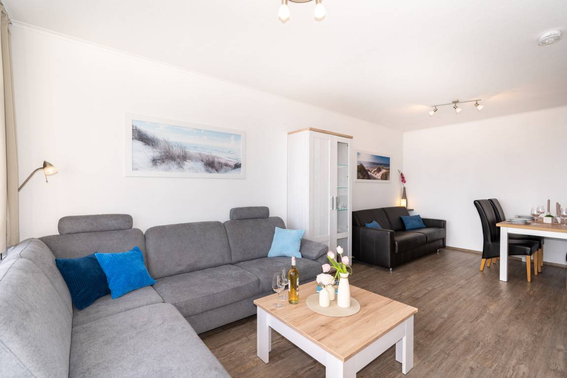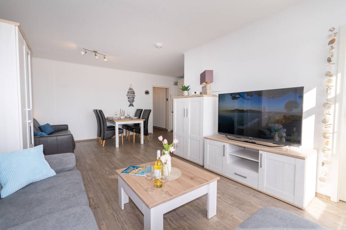 Ein kombinierter Wohn-/Essraum mit integrierter, gut ausgestatteter Küchenzeile bildet das Herzstück der Ferienwohnung. Ein großes Ecksofa, ein Esstisch mit bequemen Stühlen und ein Flachbildfernseher sorgen für Komfort und Unterhaltung. Zusätzlich steht ein hochwertiges Schlafsofa mit Matratze für 2 Personen im Wohnbereich zur Verfügung. Dieser Bereich wurde 2026 nahezu vollständig neu möbliert.