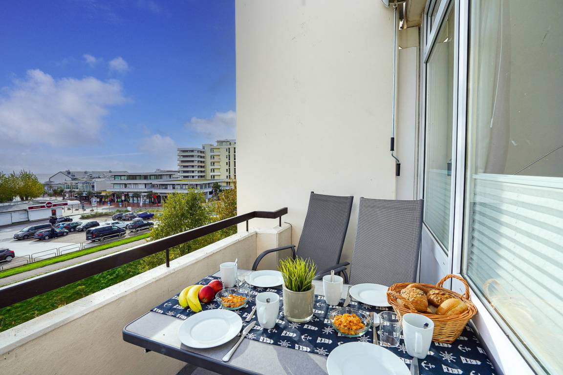 Entspannen Sie nach einem Tag am Strand auf Ihrem Balkon mit Blick auf die Seebrücke und deren Vorplatz. Bei Sonnenschein sorgt eine Markise für ausreichend Schatten.