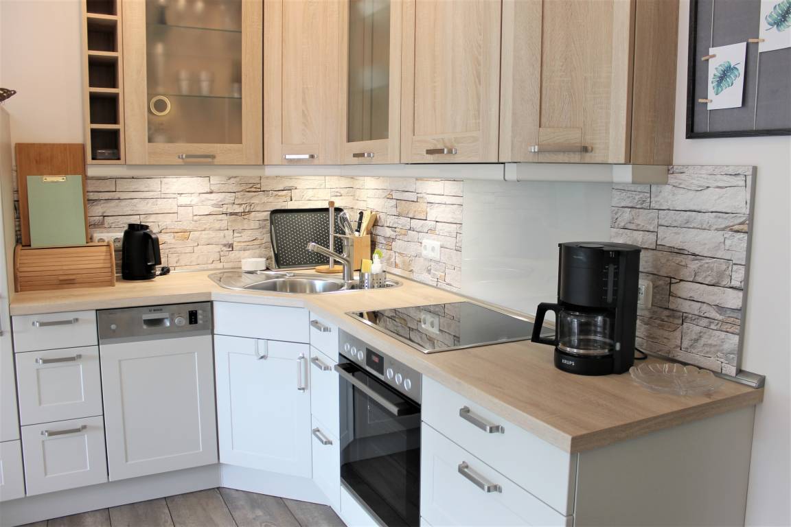 Moderne Küche mit 4er Cerankochfeld, Backofen, Geschirrspüler, Toaster, Kaffeemaschine, Wasserkocher und allem möglichen, was eine Küche benötigt.