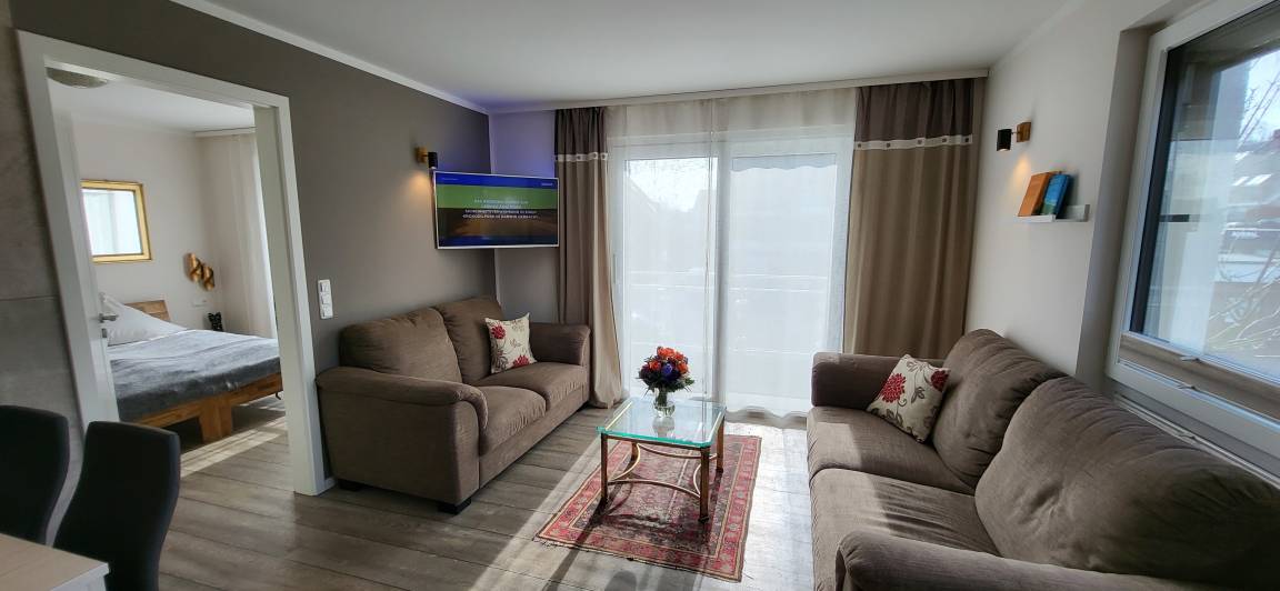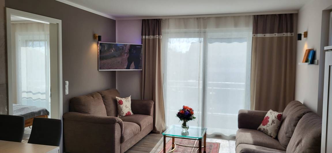 3-Zimmer Wohnung im 1. Stock für zwei Erwachsene und 2 Kinder ab 6 Jahren mit Fahrstuhl, behindertenfreundlich mit breiten Türen und breitem Flur. Zwei Schlafzimmer, Wohnküche, Bad, Balkon mit Sommermöbeln und elektr. Markise (Südlage).