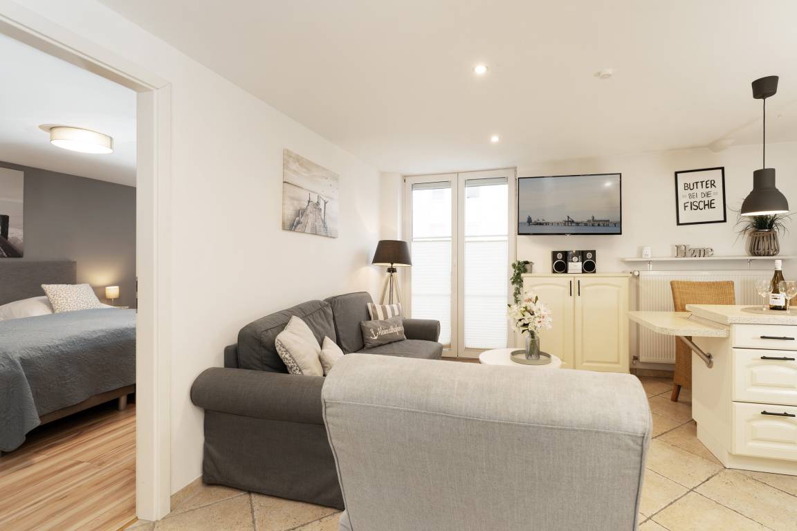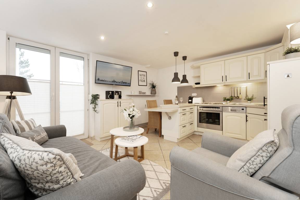 Die gemütliche Wohnung empfängt Sie mit einem freundlichen Wohnbereich, der dank Fernseher und Radio zu entspannten Stunden einlädt. Von hier aus gelangen Sie direkt auf die schöne Süd-West Terrasse mit Gartenmöbeln – ideal, um die frische Ostseeluft zu genießen. Bitte beachten Sie, dass das Grillen nicht gestattet ist.