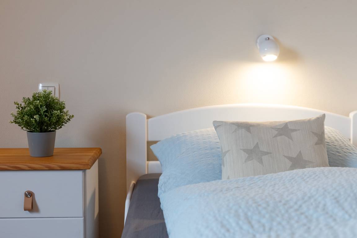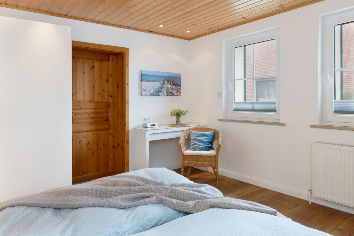Alle 3 Schlafzimmer haben Außenjalousien. Ein geräumiges Schlafzimmer mit Doppelbett (180 x 200 cm) ohne Fußteil hat direkten Zugang zum eigenen modernen, barrierefreien Bad mit Bodendusche. Ein Schreibtisch mit Sesselstuhl bietet eine zusätzliche Ablagemöglichkeit.
