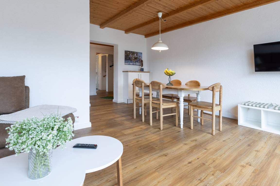 Der großzügige Wohnraum bietet Zugang zur Terrasse und die moderne Wohnlandschaft mit Blick in den Garten lädt zum Relaxen ein. Der Flachbild-TV mit DVD-Player, sowie CD-Player und Radio sorgen für Unterhaltung – wann immer gewünscht. Am großen Esstisch könnt ihr gemeinsam speisen oder einen Spieleabend verbringen. Akzente mit Einbaustrahlern in der Decke machen den Raum gemütlich.
