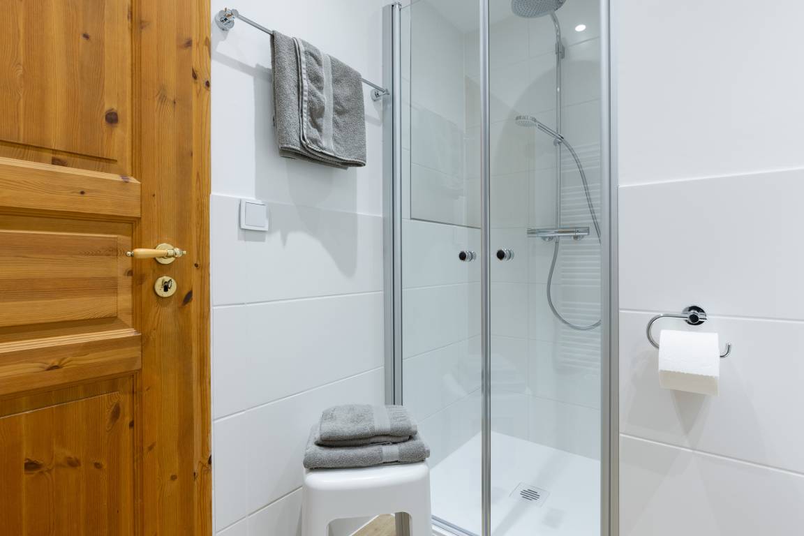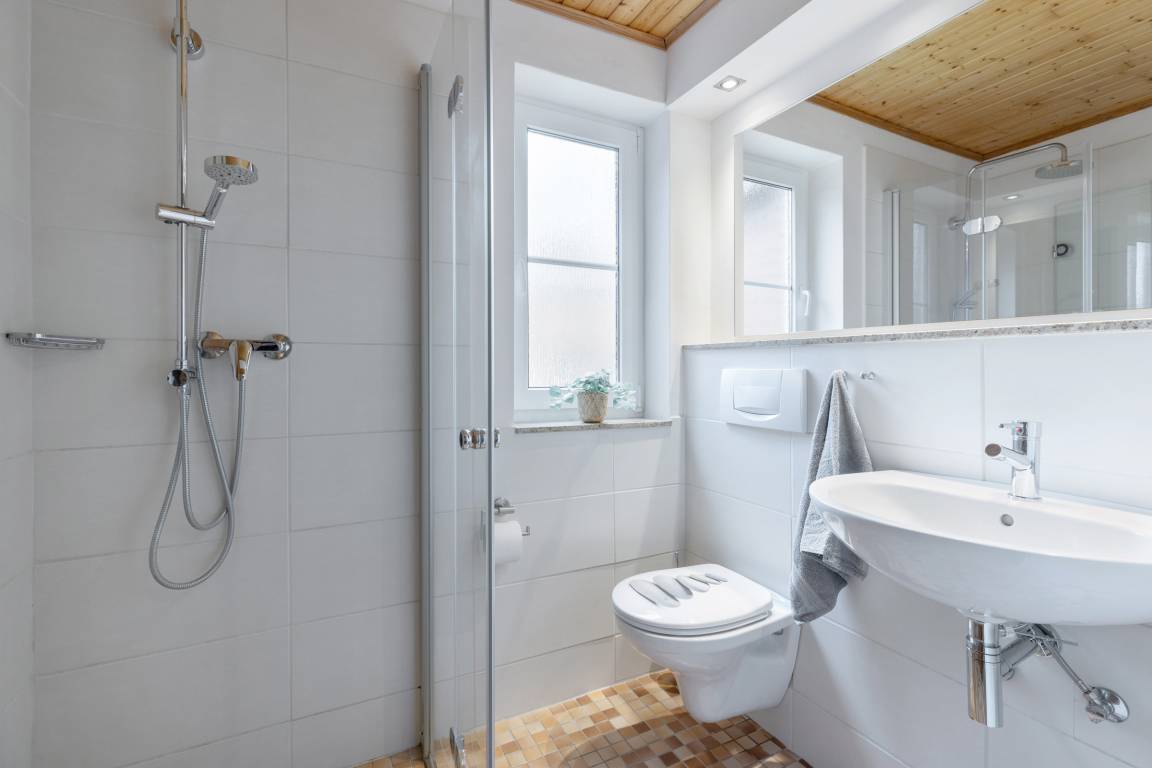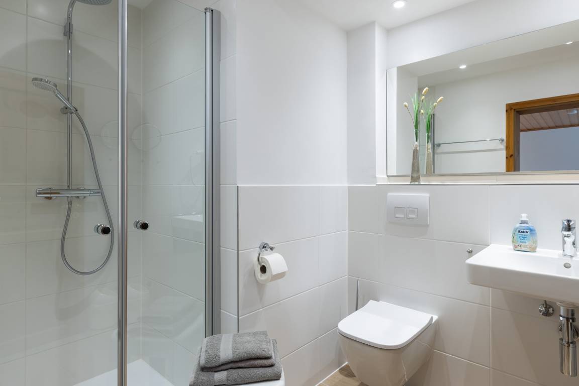 Das zweite Bad mit barrierefreier Bodendusche und WC ist modern gestaltet und vom Flur zu begehen.