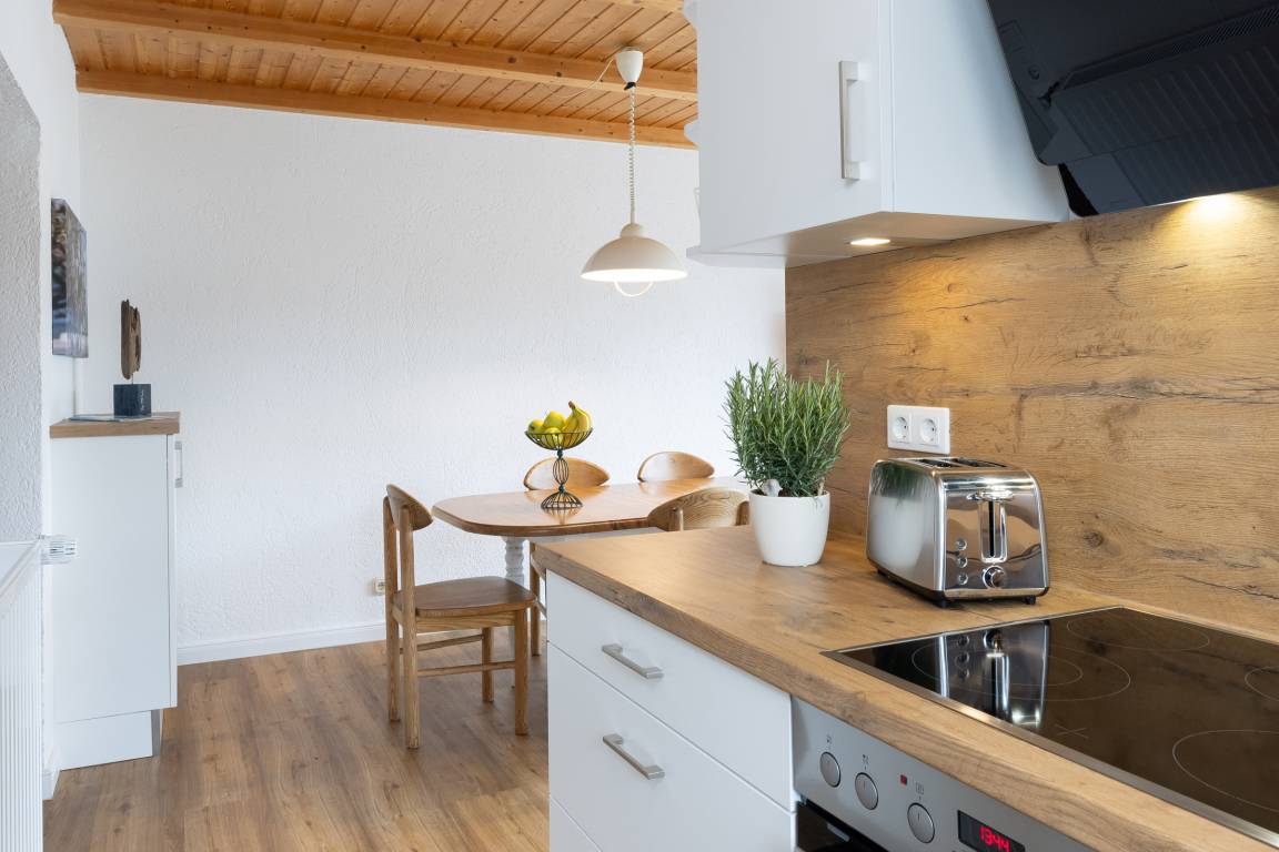 In der zum Wohnraum halboffenen Komfort-Küche befinden sich Ceranfeld, Backofen, Geschirrspüler, 3-Sterne-Kühl- und Gefrierschrank sowie Mikrowelle.