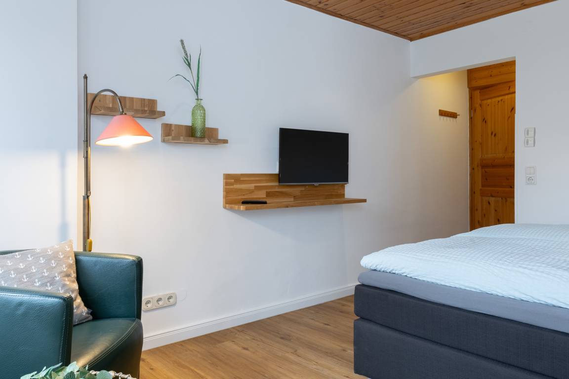 Das zweite geräumige Schlafzimmer mit einem komfortablen Boxspringbett (180 x 200 cm) hat Zugang zur eigenen kleinen Terrasse und bietet einen wandmontierten Flachbild-TV sowie einen bequemen Sessel mit Beistelltisch.