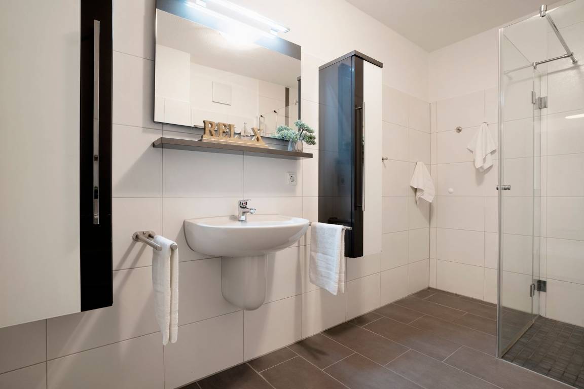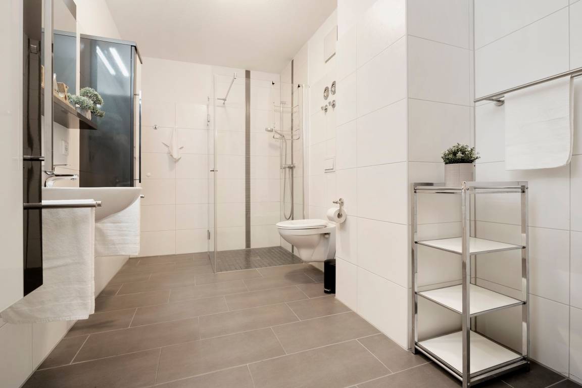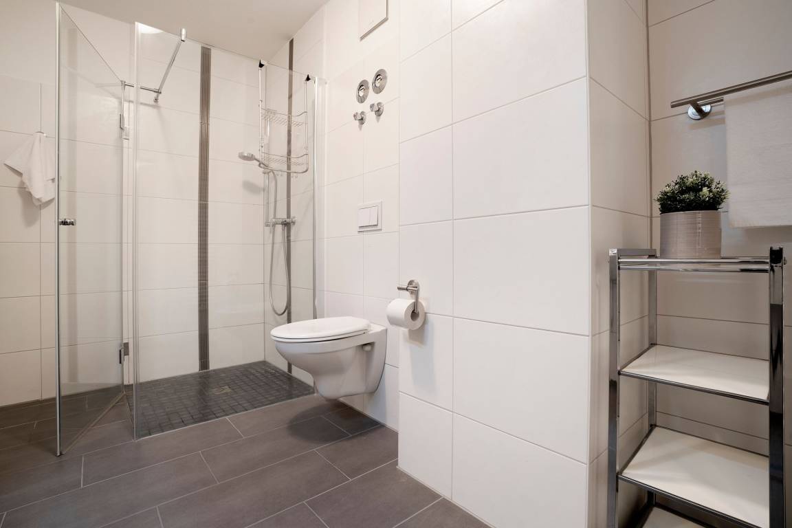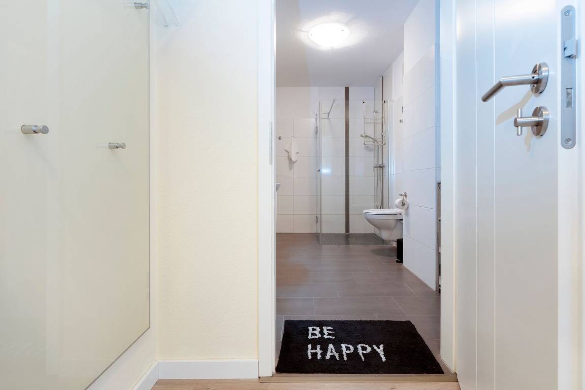 „Nur eine Anmerkung bzw Anregung: Der Boden Abfluss der ebenerdigen Dusche müsste regelmäßiger von Haaren und Fusseln befreit werden. Das Wasser lief schlecht ab. Baumangel: Das Gefälle des Bodens im Bad geht nicht Richtung Abfluss sondern zur Wand. Ein Duschvorhang könnte helfen.“