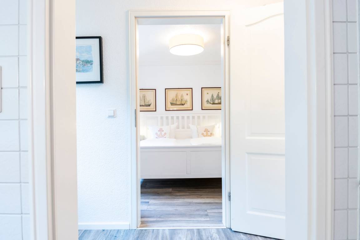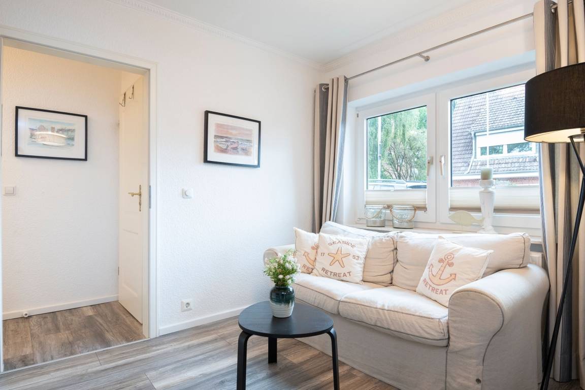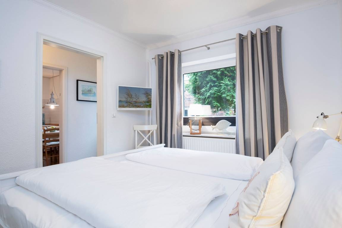 Der helle Eingangsbereich führt in alle Räume. Linkerhand liegt das separate Schlafzimmer im zeitlos schönen Landhausstil. Es liegt ruhig auf der Rückseite des Hauses und ist mit Flat-TV, komfortablem Doppelbett (2x 90x200 cm), sowie großzügigem Schiebetürenkleiderschrank für Ihre Urlaubsgarderobe ausgestattet. Rechts geht es dann in die separate, gut ausgestattete Küche mit Annehmlichkeiten wie ein neues Induktionskochfeld mit Backofen, Mikrowelle, neue Spülmaschine und Nespresso-Kaffeemaschine mit Milchaufschäumer. Ein gemütlicher Esstisch für 4 Personen sorgt für Geselligkeit und nette Runden. Geradeaus führt der Flur in das tageslichthelle Bad mit Dusche, Badewanne, Waschbecken mit beleuchtetem Spiegel und WC, herrlich großzügig gestaltet und klassisch weiß gefliest startet man hier gern in den Tag. Ihre Reisegarderobe können Sie hier in einem neu installierten Waschtrockner (Waschmaschine inklusive Trockner) reinigen.